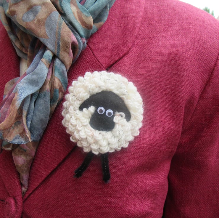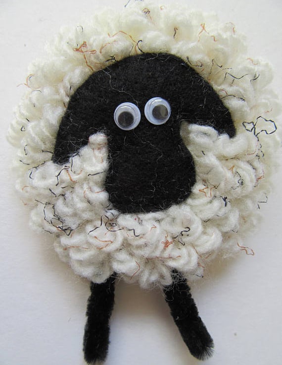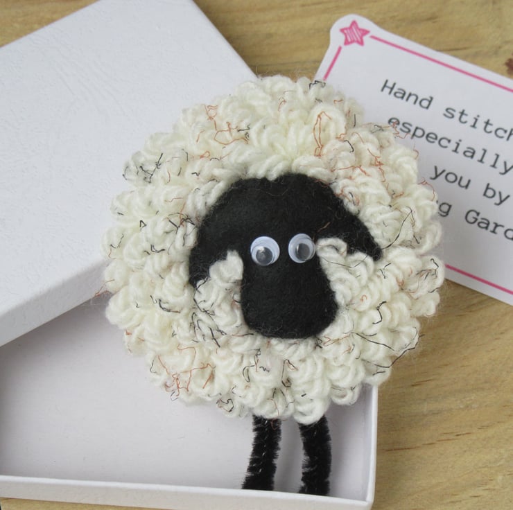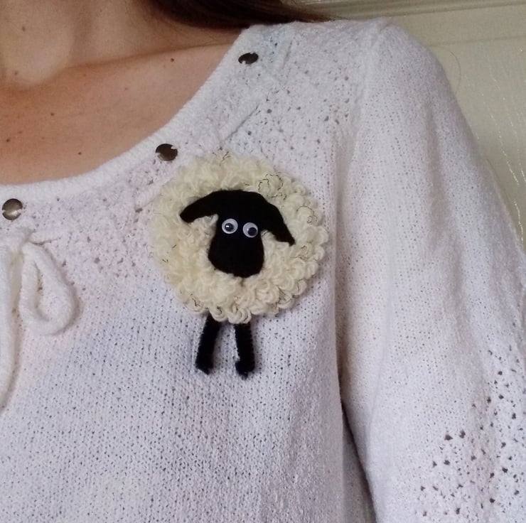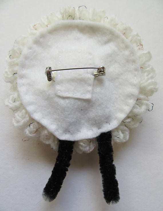 The light cream acrylic wool which is flecked with black and brown strands to give a realistic woolly feel is all hand stitched onto a white circular piece of acrylic felt. The sheep badge is backed by another piece of felt, the metal brooch pin sewn securely in place and covered by another rectangular piece of white felt to hide any stitches. The face is black felt, with cute googly eyes glued on which gives loads of character. The legs are black chenille pipe cleaners.