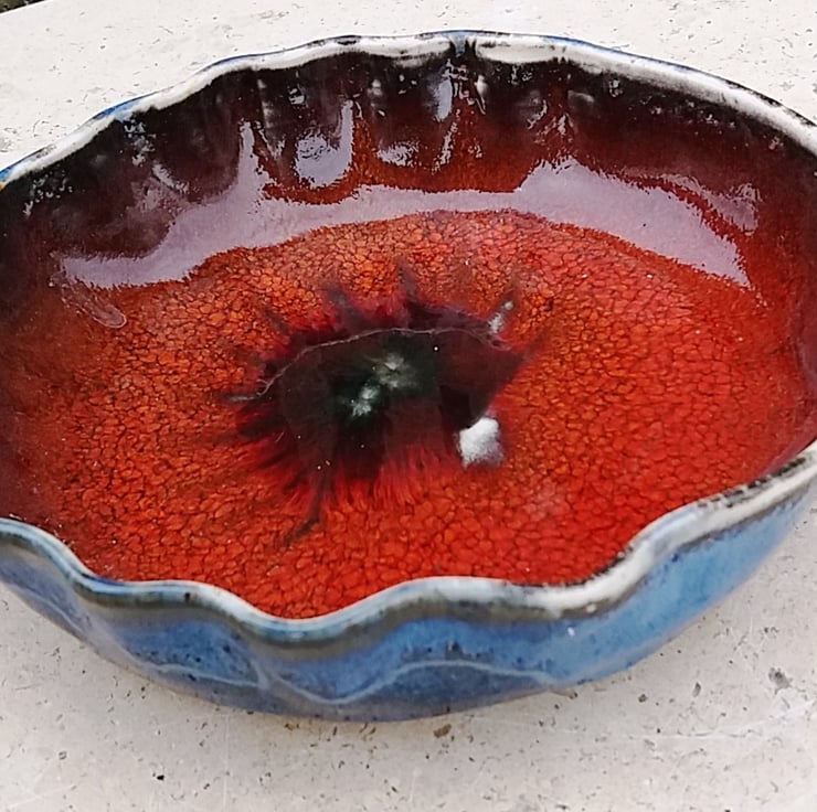 3. SS; red glaze inside, glossy blue out with one melted green bead glass, 17 1/2 cm diam x 3 1/2 deep. £20