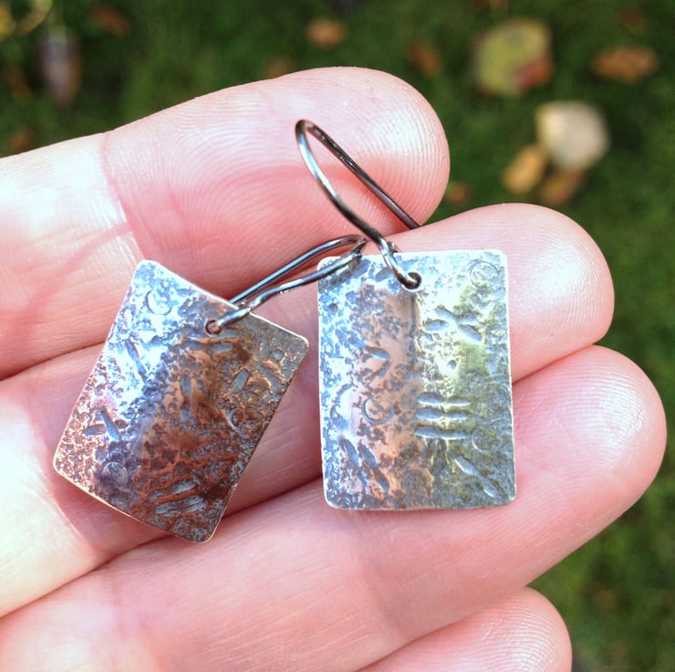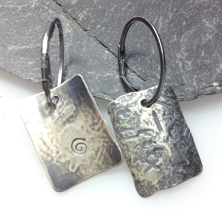 I have textured them with hammers and punches, then oxidised them to pick out the pattern. They are slightly curved, and hang from lever back hoops or handmade hooks.If no preference is stated I will send hoops.