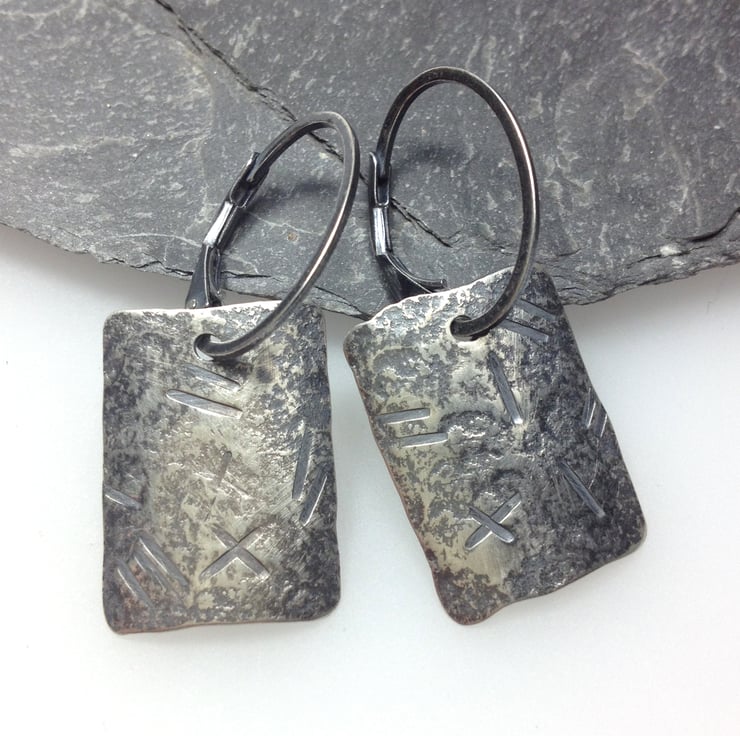 These sterling silver rectangular earrings remind me of time worn stone tablets with hints of ancient text .