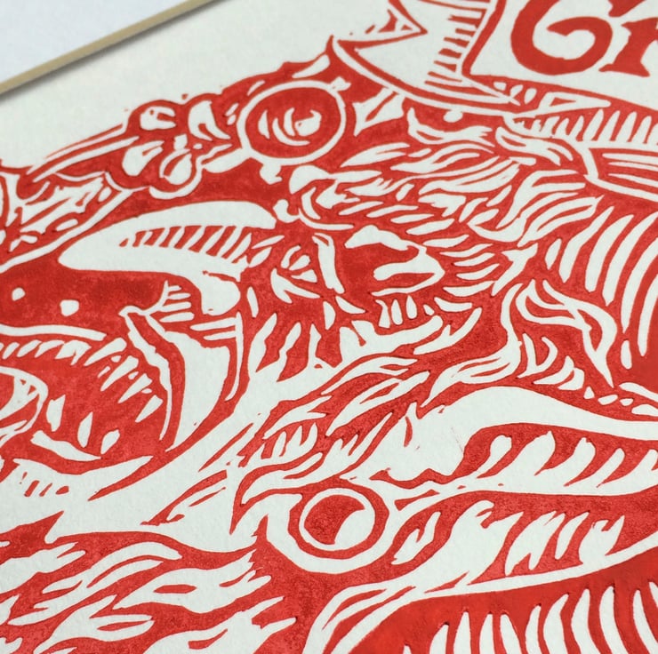 Water-based black, matte ink print on white 140gsm cartridge paper, hand-hand pressed with a spoon and touched up by hand also to give it a consistent tone all over.
