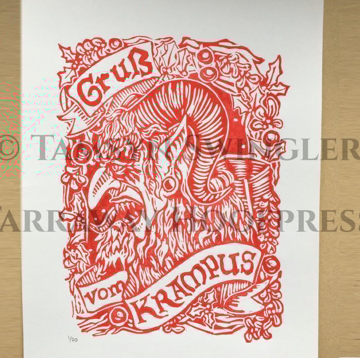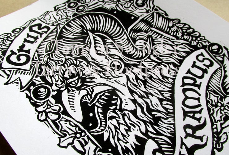Alpine folklore brings us Krampus, the friend of St Nicholas, and whilst St Nicholas rewards the good little boys and girls at Christmas time, Krampus punishes them, either by thrashing them with branches or carrying them off in a potato sack or a basket on his back. He is shown in profile here with the German greeting, Greetings from Krampus, with a boarder of branches, baubles, holly and mistletoe.