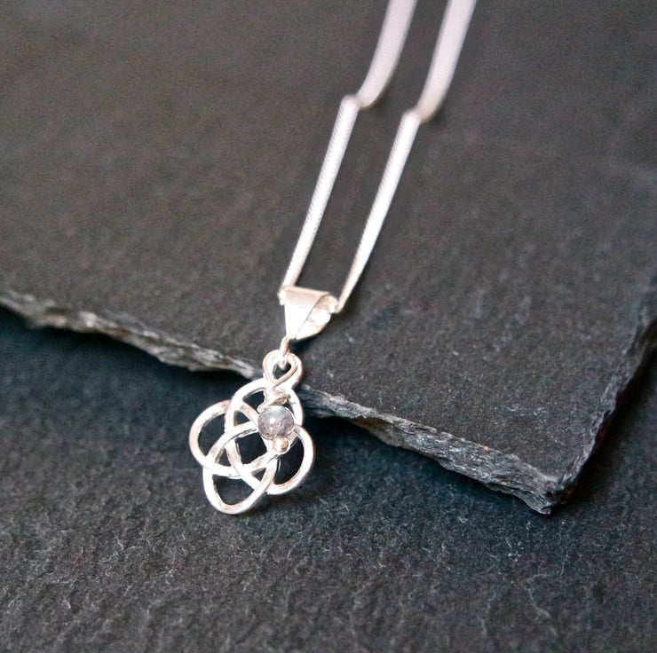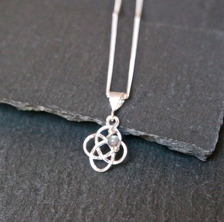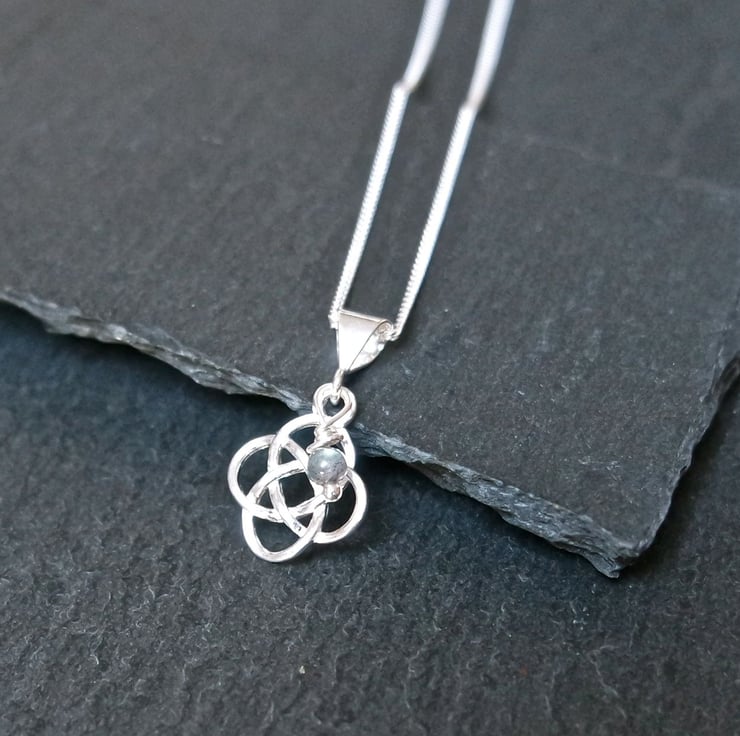 A small celtic knot pendant accompanied by a tiny green and blue flashing Labradorite bead on a 925 sterling silver necklace