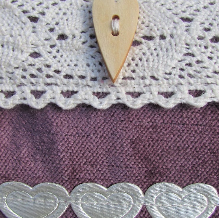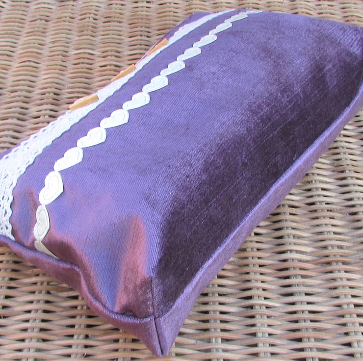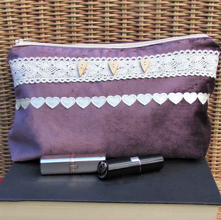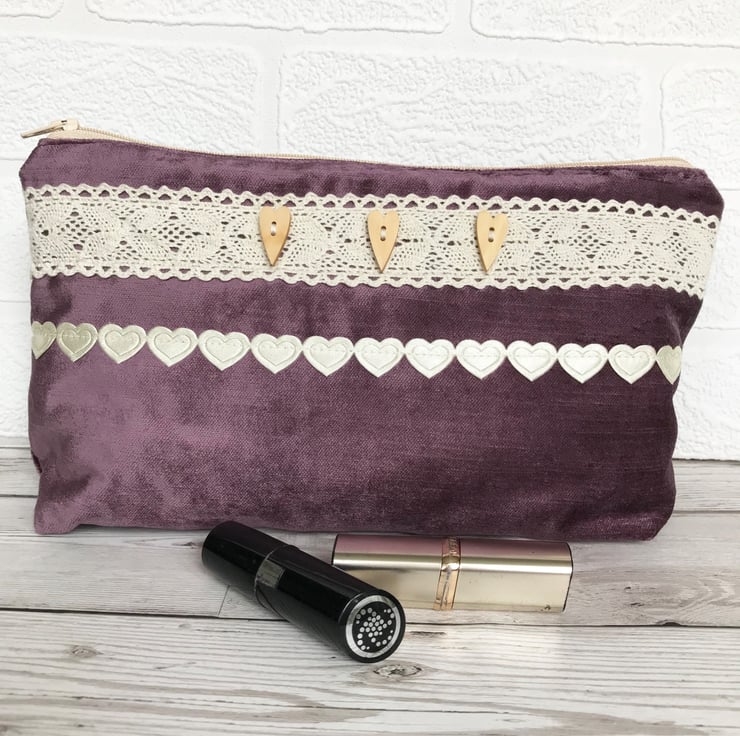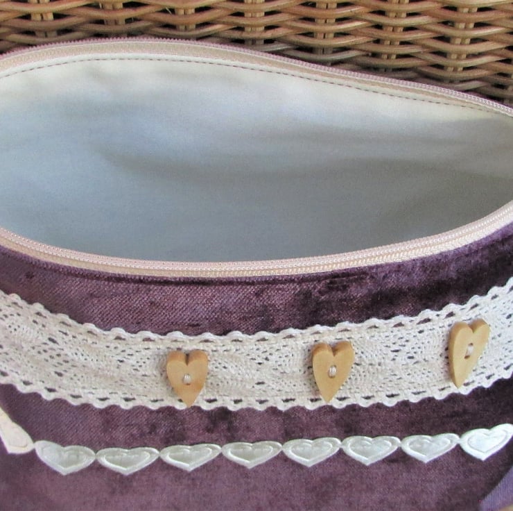 A large cosmetic bag in a luxurious plum purple velvet-finish fabric. The make up bag is embellished with wide cream lace trim with three wooden long heart buttons and finished with ribbon of pretty cream satin-finish hearts. The cosmetic bag has a cream zip and is lined with cream fabric. The base of the bag is boxed giving lots of space inside.