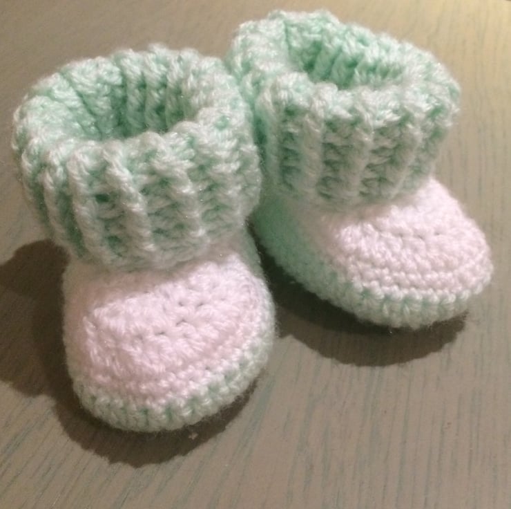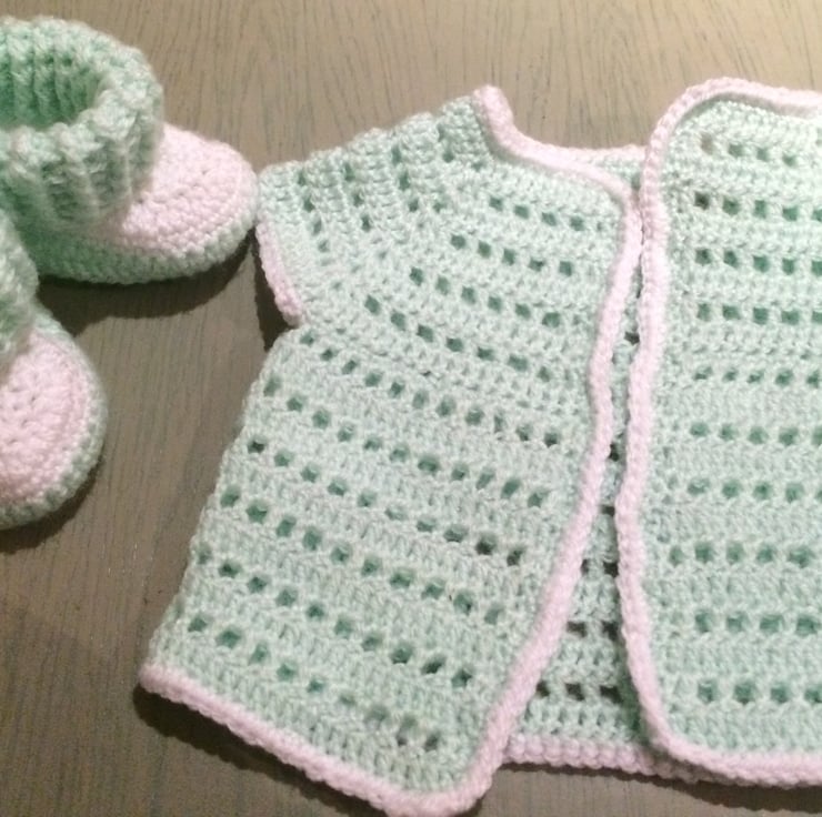 Lovely crocheted matching cardigan and booties. Short sleeved cardigan has a lacy pattern with matching booties. Would make a wonderful gift.