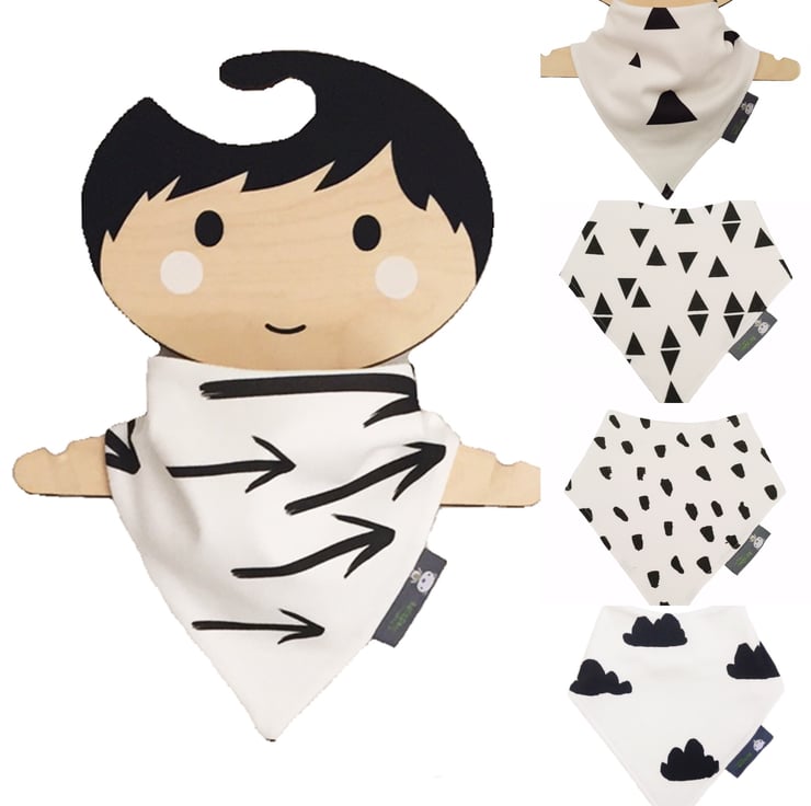 Luxurious baby bandana bib in BLACK ARROWS Organic Knit Jersey fabric to give at modern edge to your babies outfit. Lined with an ultra soft & absorbent Organic Bamboo & Cotton fleece fabric, keeping moisture away from their chests whilst keeping their clothes dribble free & looking ultra cute.