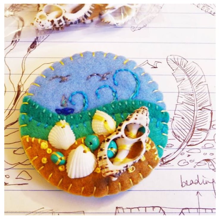 This is for a sunny seaside inspired beach hut design felt brooch that I used tiny shells, turquoise, shell button and tiny beads to light up the pin that I individually designed and handcrafted.