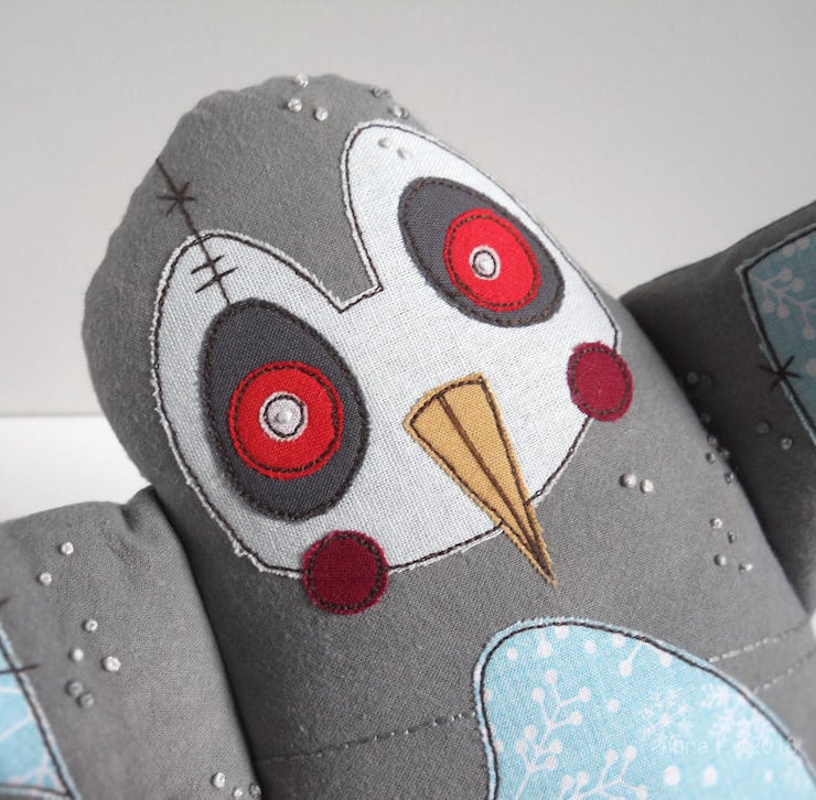 i’ve hand dyed the cotton calico a corpse-grey colour, then pale blue irish linen & cotton fabrics have been appliqued, with the details drawn on using freehand machine embroidery. his tummy patch, and a co-ordinating heart on his bottom, feature a pale blue snowflake print cotton.