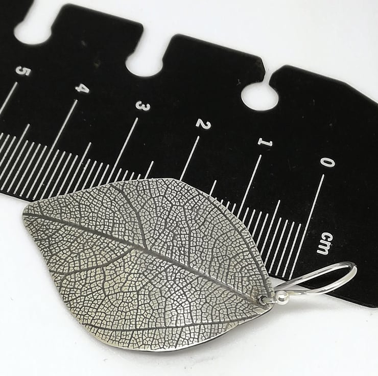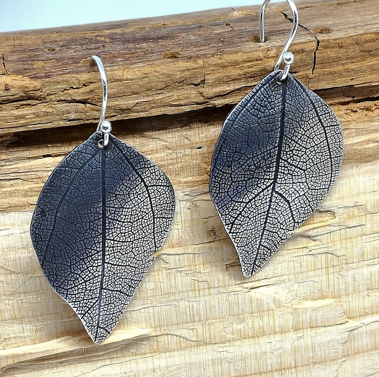 These elegant earrings are made by heating the silver then rolling it with a dried leaf. The silver is then oxidised with the excess being gently rubbed off, leaving the dark veins of the leaf showing up. These prove to be popular as each pair is slightly different in size and impression. The leaf can only be rolled once as it loses it's texture during the process