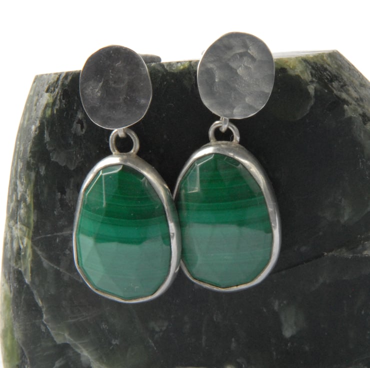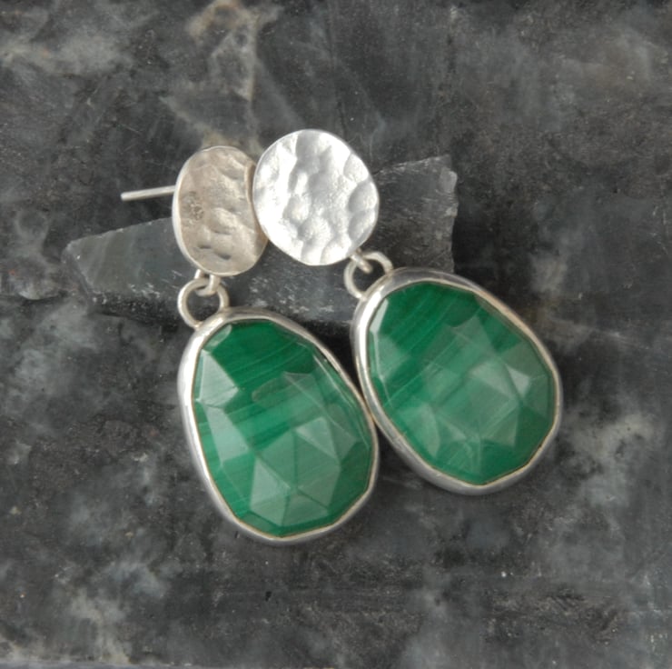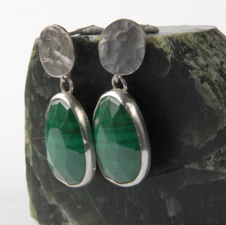 These sterling silver earrings feature faceted cabochons of stripy green malachite hanging beneath textured stud tops. The malachite has a subtle stripy pattern in shades of mid and deep green and unusual checker board cut (facets on the top of the cabochon) which adds a gentle sparkle as they catch the light making these earrings suitable for day or night. The top of the earring is an oval of sterling silver which has been textured with a hammer to mimic the facets of the malachite and finished off with silver posts and scrolls.