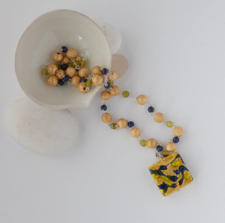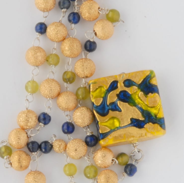 This opulent necklace features a handmade murano glass bead, lavishly coated in gold foil and drizzles of green and blue glass, which hangs beneath a beaded necklace of gold plate, vasonite and lapis beads picking up on the colours of the focal bead. Looks great with an LBD, over a dark polo neck knit or against sunkissed skin in the warmer months this is a very versatile necklace.