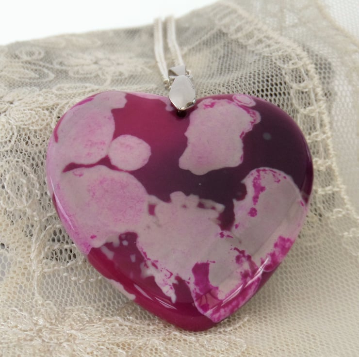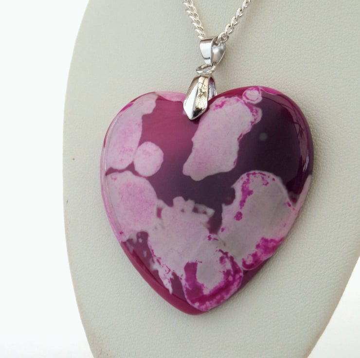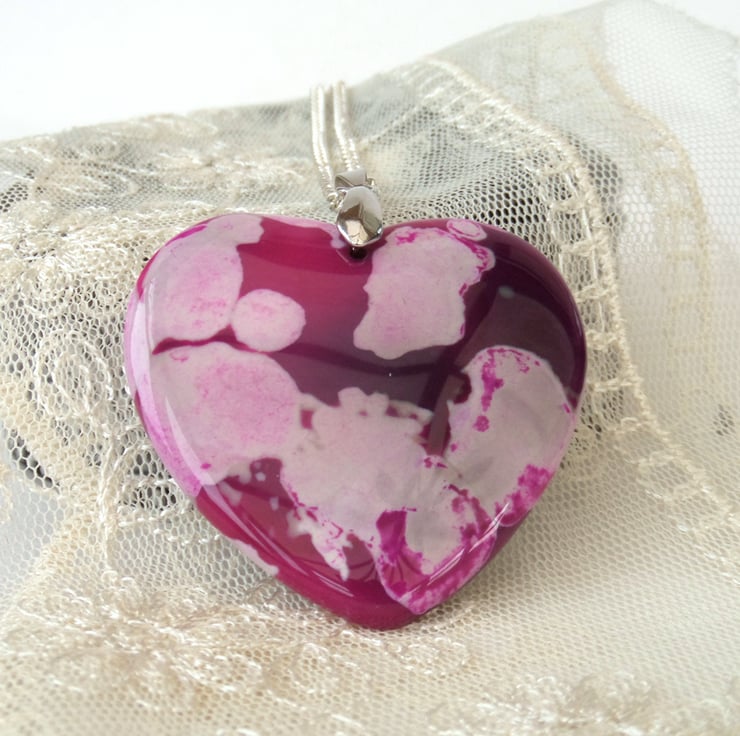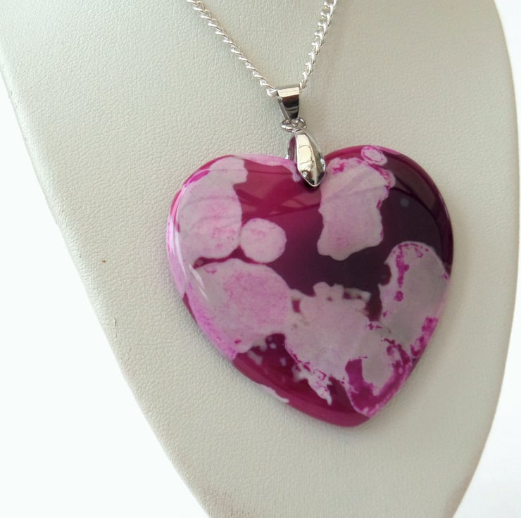 A beautiful and unique pink agate heart hangs from a silver plated chain to make this one-of-a-kind pendant necklace.