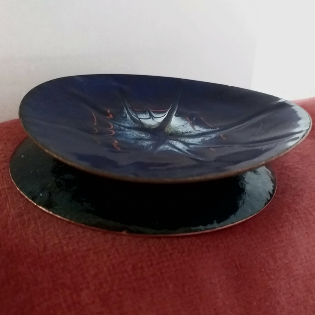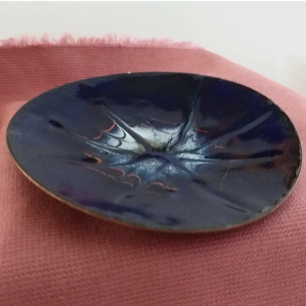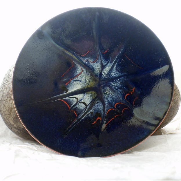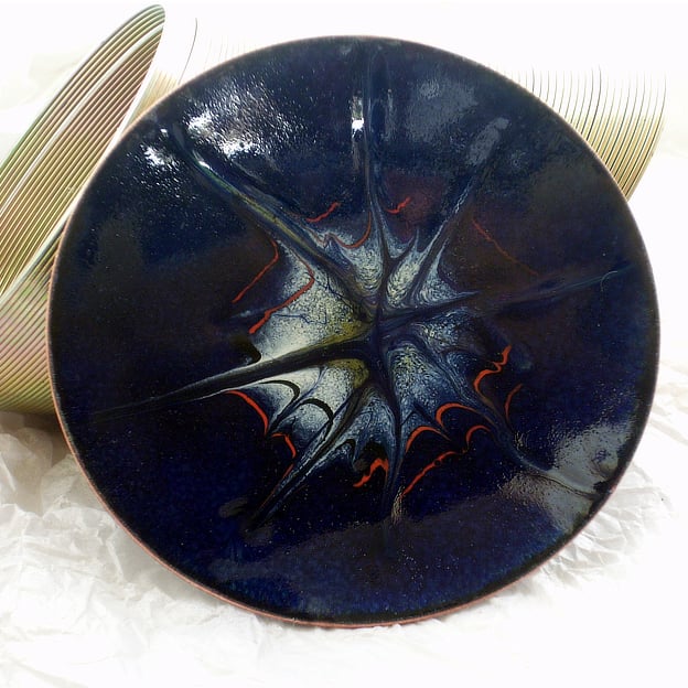 I have laid a coat of deep blue enamel over a base of clear enamel built up on the copper dish. After firing that coat I have scattered white enamel powder in the centre and added rods of red enamel around the white. When the dish was at red hot, in the kiln I disturbed the surface of the enamel with a steel point to make the unique starburst patterning that decorates the blue.