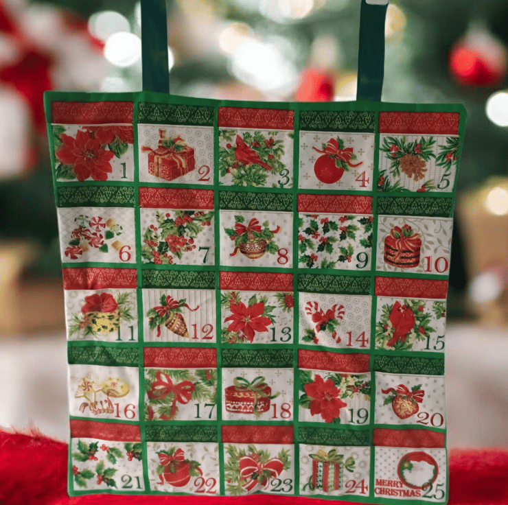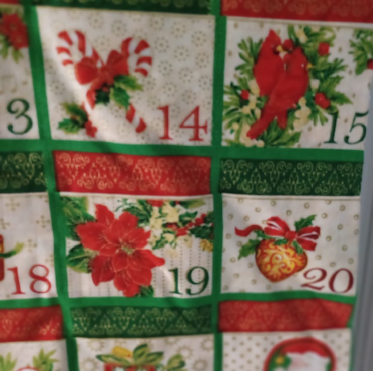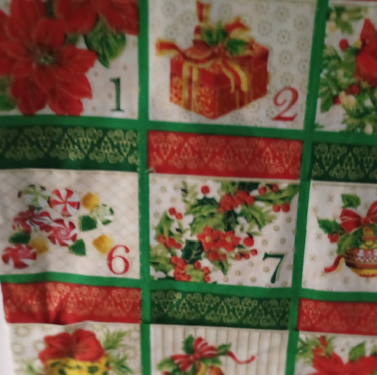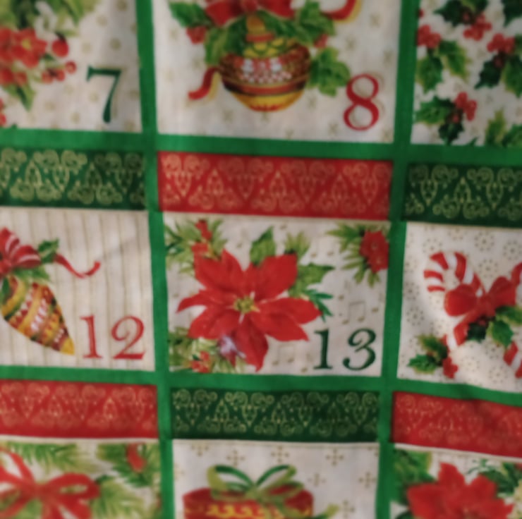 A beautiful and traditional dark red and green advent calendars with festive flowers depicted on each pocket. The calendar is padded slightly and backed with a dark green snowflake fabric, it also has two hanging loops. The calendar has plenty of space for adding your own sweets or gifts and can be reused each year. This advent calendar can become a family heirloom and is plastic free, unlike the shop bought ones.