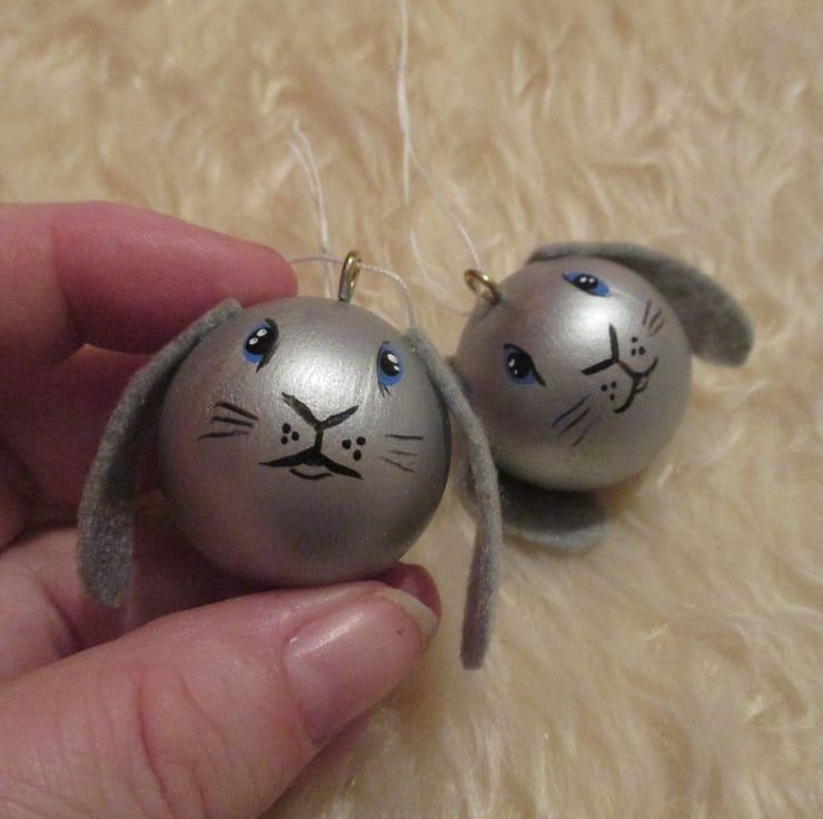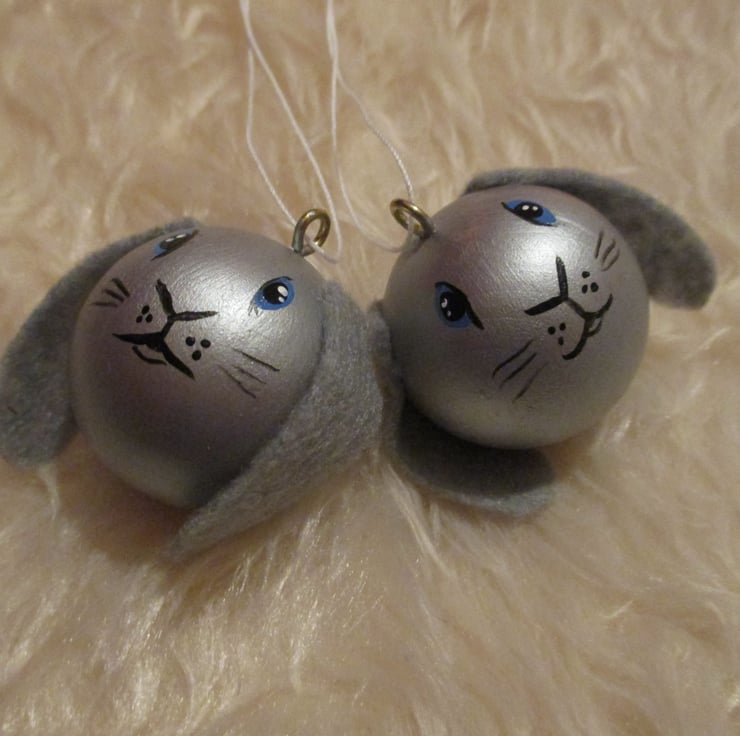 This listing is for the pair of bunny baubles pictured. They are silver with grey ears and blue eyes.