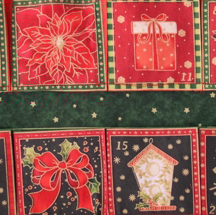 A beautiful and traditional dark red and green advent calendar with festive icons depicted on each pocket. The calendar is padded slightly and backed with a plain cotton, it also has three hanging loops as well as dowling and ribbon to help with hanging. This calendar has plenty of space for adding your own sweets and can be reused each year. This advent calendar can become a family heirloom.