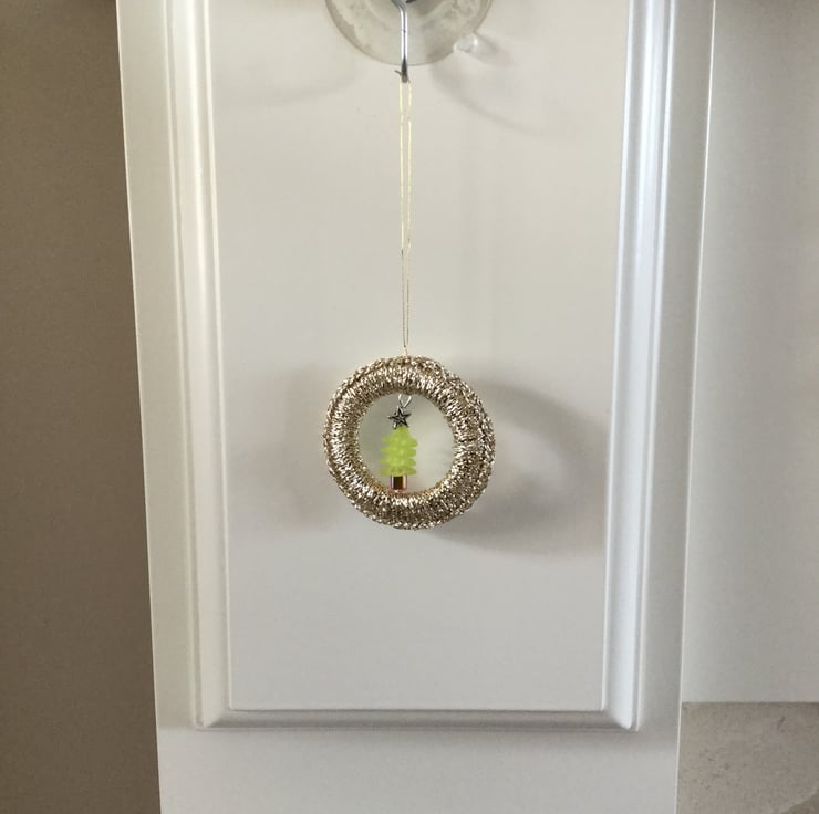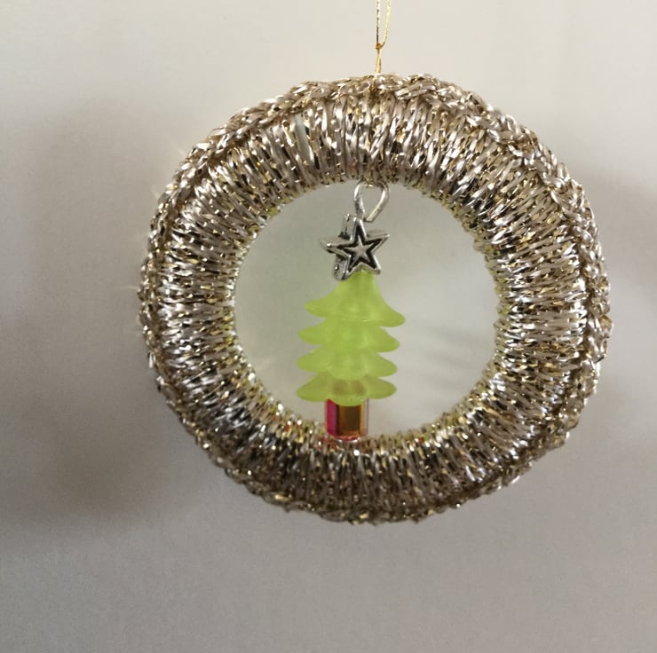 There is a green and red beaded tree with a tiny star on top,which I have made, fastened in the middle.