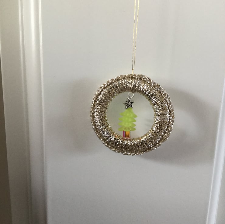 I have crocheted over a plastic ring with a pale gold lurex yarn to make the outer circle.