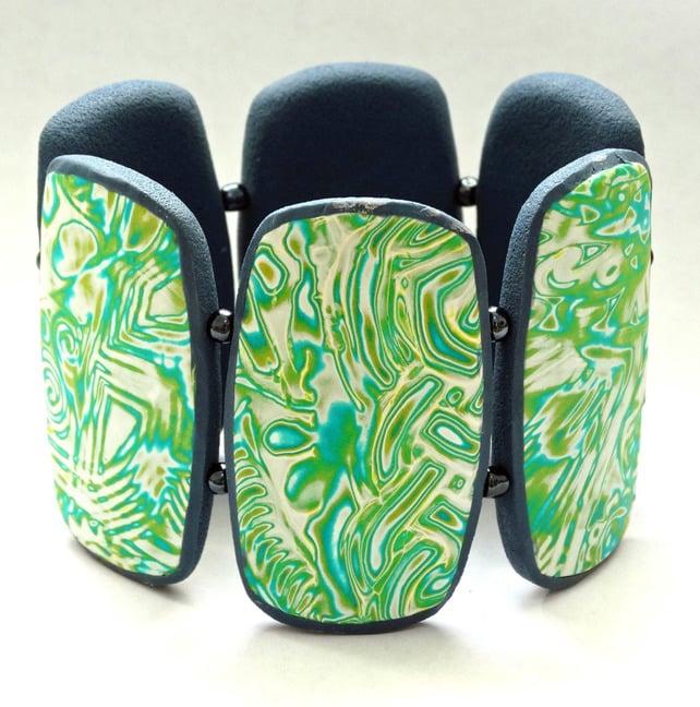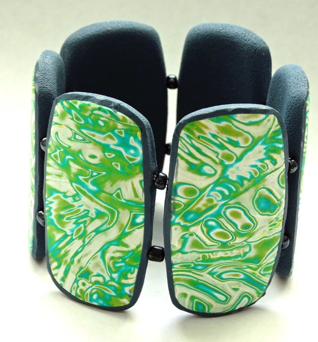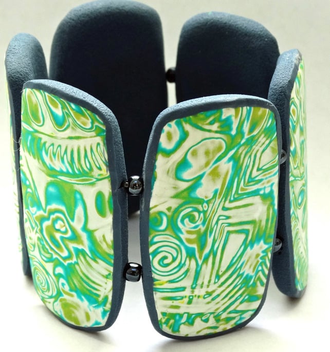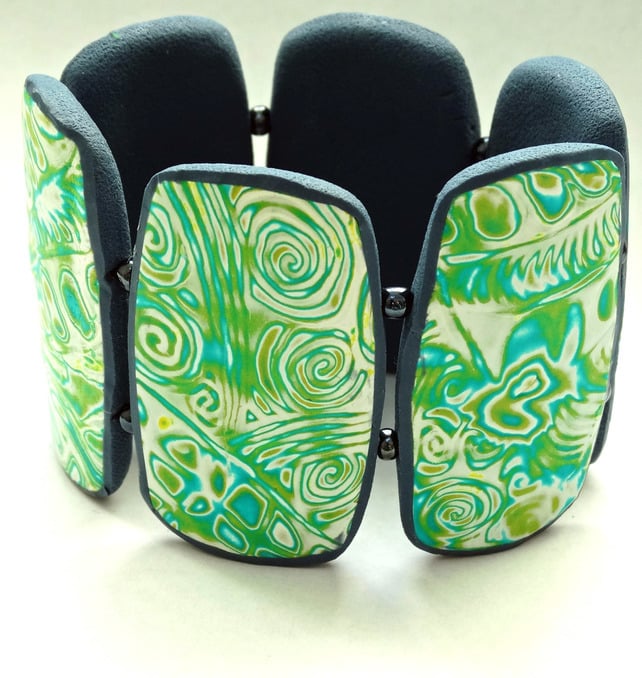 This is a polymer clay bracelet using the techniques developed by Melanie Muir. It is made by applying thin polymer clay veneers to the front of the beads. The back of the beads has been covered with textured plain blue grey clay to offset the bright colour scheme on the front of the beads. The beads are slightly curved for a comfortable fit. The beads are strung on an elasticated stringing material for ease of wear with small bead spacers between each large panel.