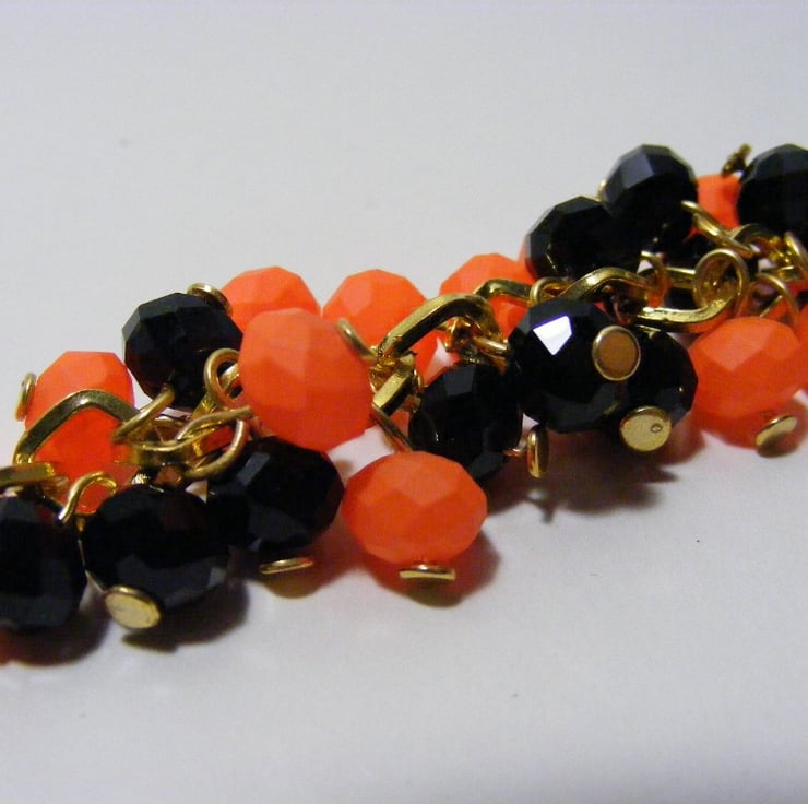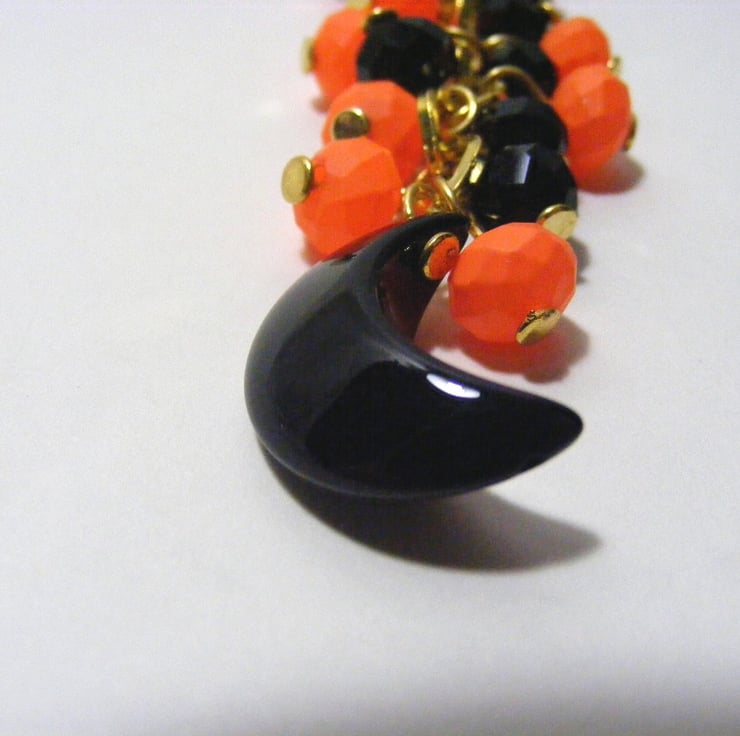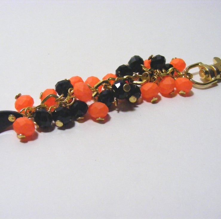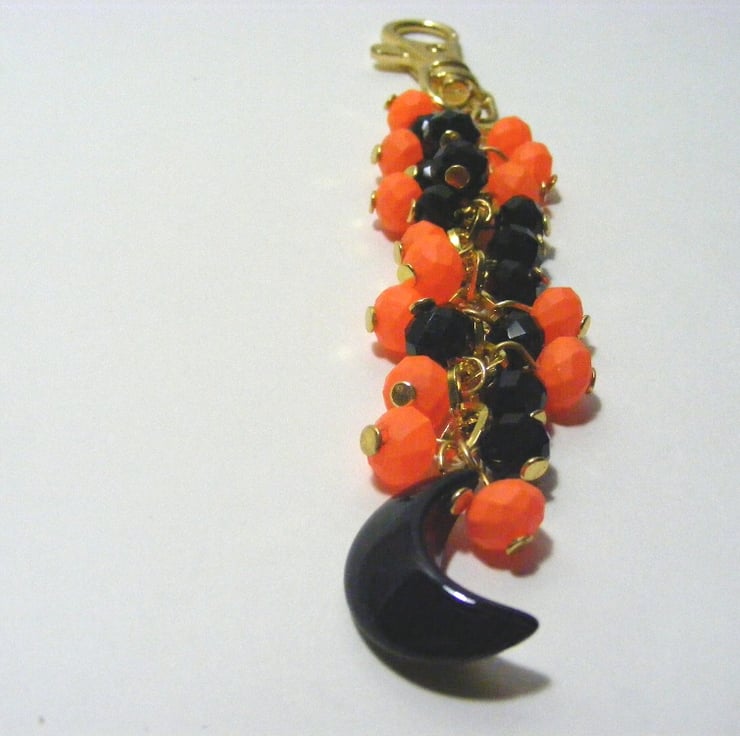 Bag charm is made with 6 x 8 mm black faceted crystal rondelles, 6 x 8 mm neon orange glass rondelles, a 20 x 8 mm black agate gemstone crescent moon bead, headpins, clip and gold plated diamond shaped chain.