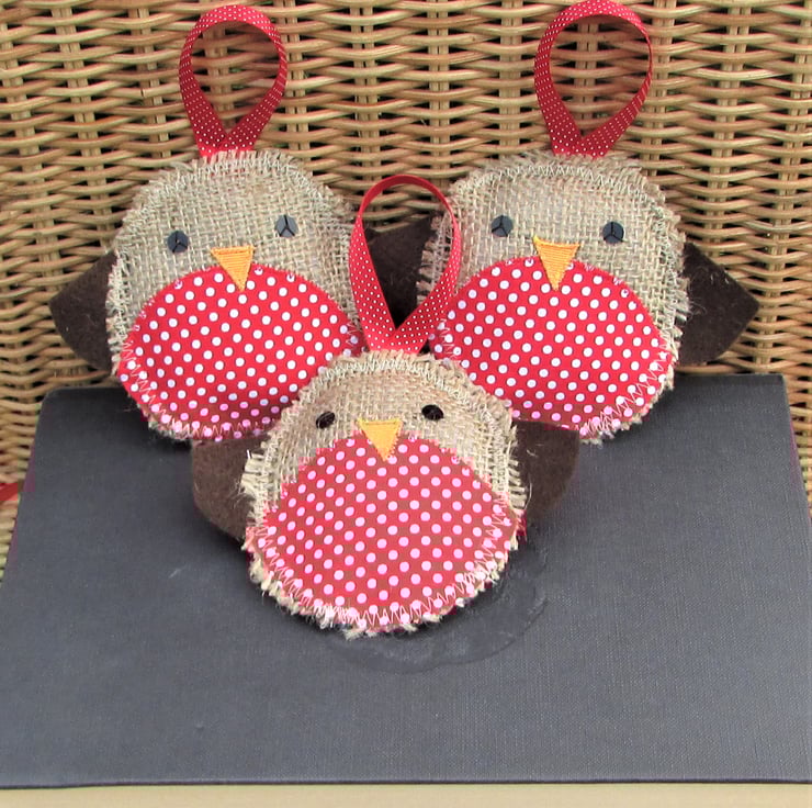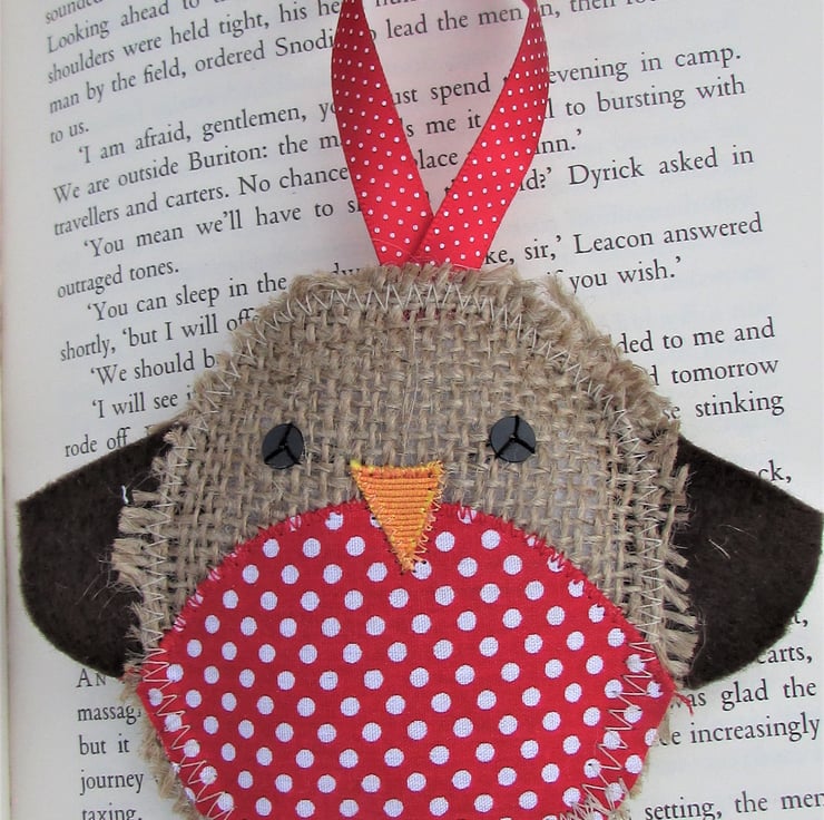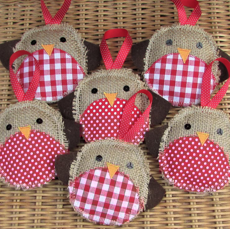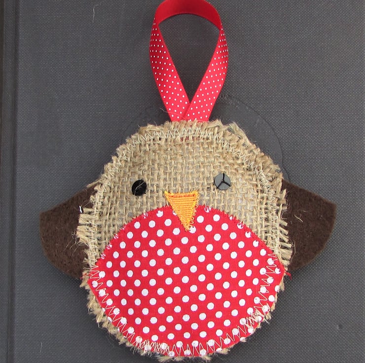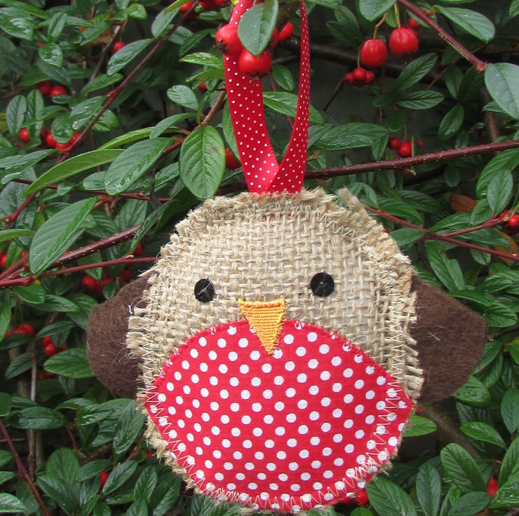 Listing is for ONE Christmas Robin hanging decoration. This cute Christmas decoration is a rustic Christmas Robin made from hessian. The red breast is made from red fabric with white polka dots. The Robin has black sequins for eyes, an orange fabric beak and brown felt wings. The Robin has a red hanging ribbon with white polka dots.