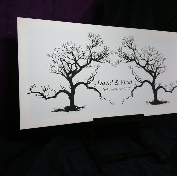 Add a unique modern twist to your wedding with this personalized canvas love heart wedding tree print. Printed on canvas approximately 820 x 430 mm and personalised with the happy couples names and date of the wedding, it comes as a pre-stretched canvas, complete with two fingerprint ink pack of various shades of green.... The rest is up to your guests to add their individual finger print on your big day.