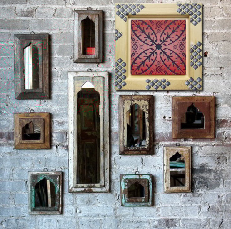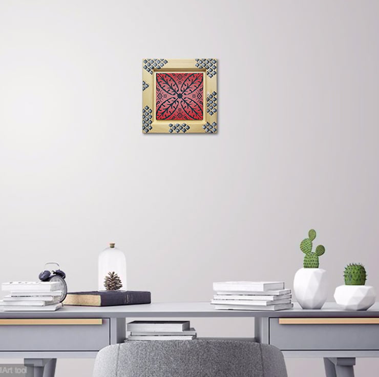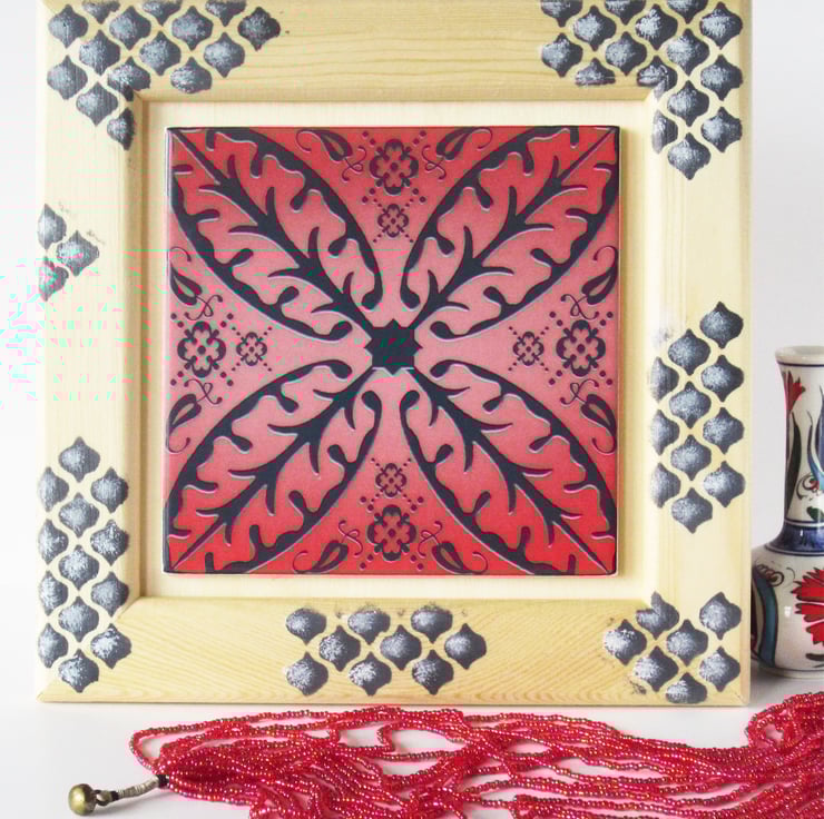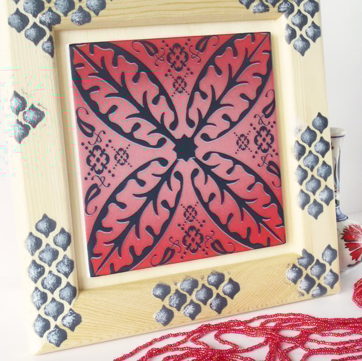 Red Pink and Black North African Inspired Ceramic Tile in Decorated Wooden Frame