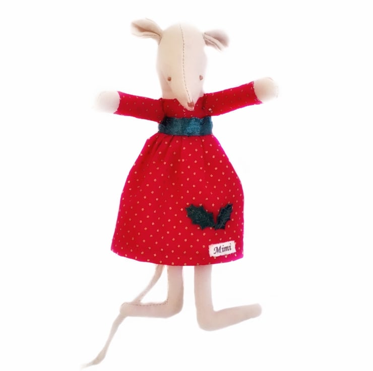 Mimi is a shy little mouse in a bright red dress covered in tiny gold spots, with a green satin waistband. The dress is trimmed with holly on the skirt. Cute!
