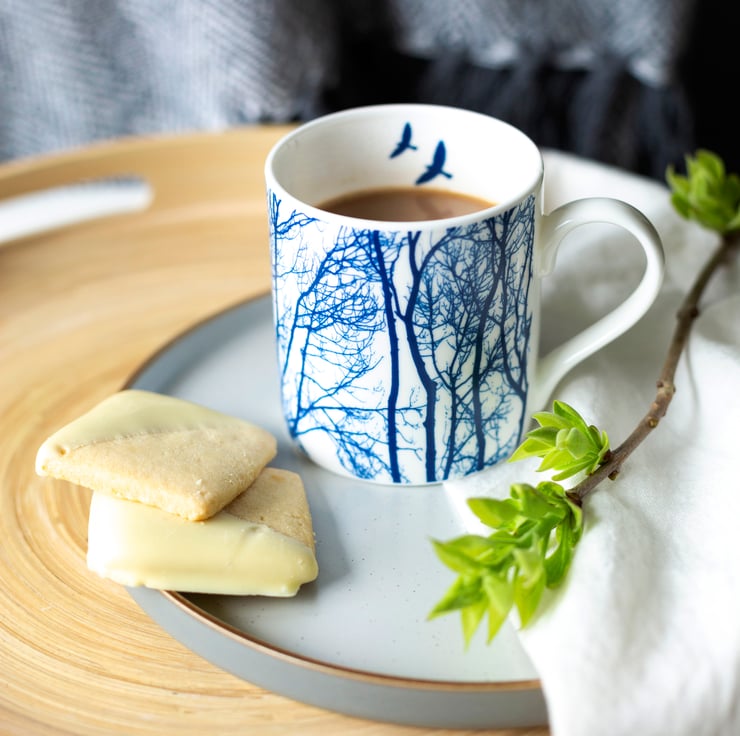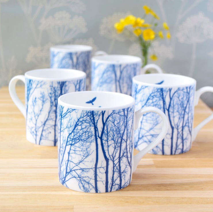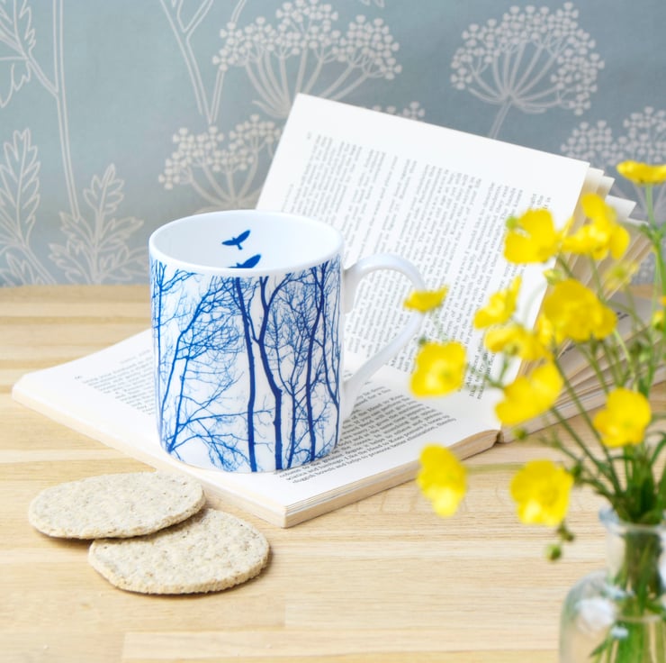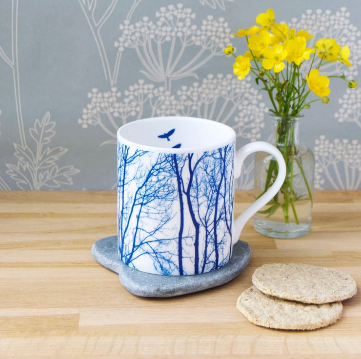 The delicate intricacies of bare winter tree branches and the patterns they create inspired this unique blue and white fine bone china mug. Two blue birds are depicted in mid flight on the inside of the mug