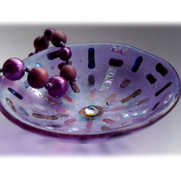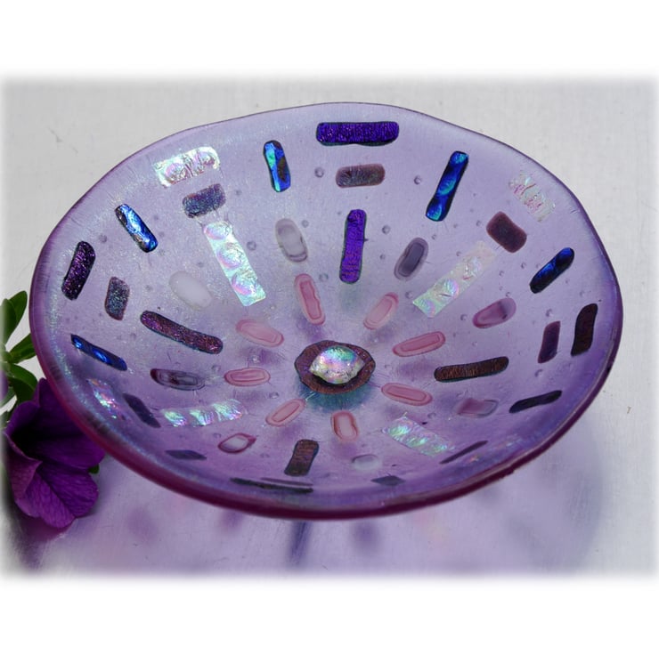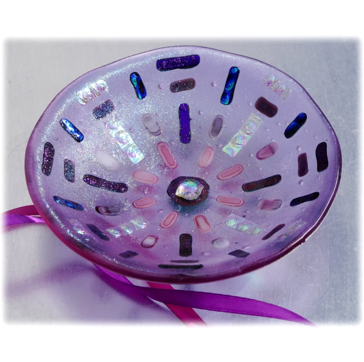 This round dish has a base of transparent lilac glass. This is topped with a layer of iridescent rainbow clear glass. When the light catches the edge the rainbow really shines out.