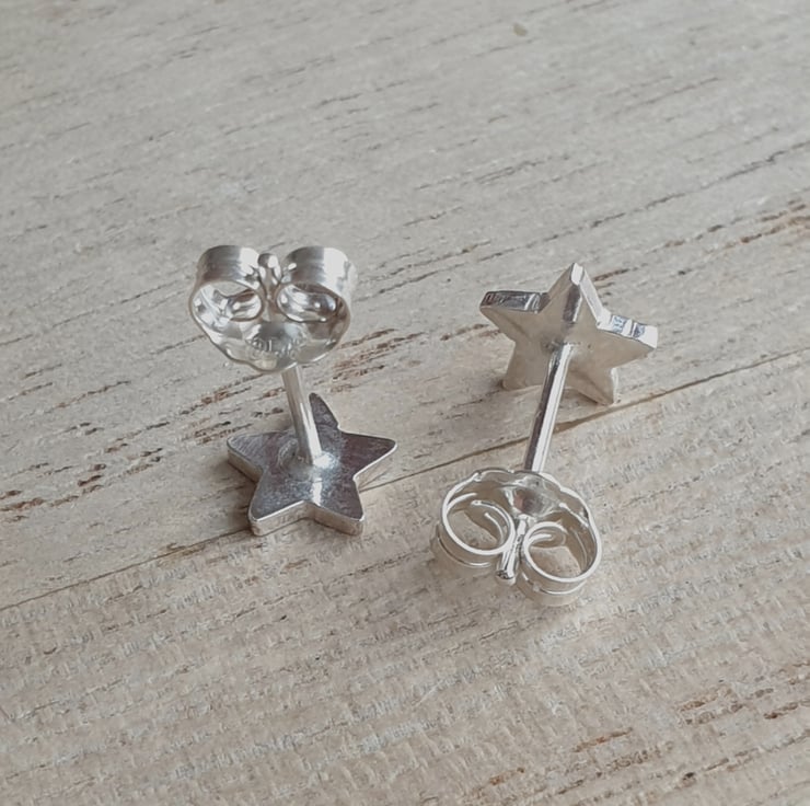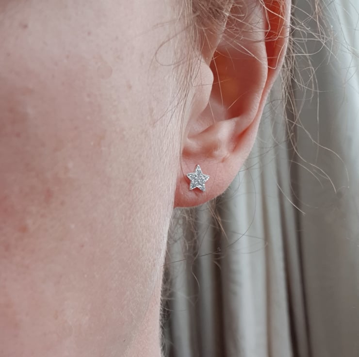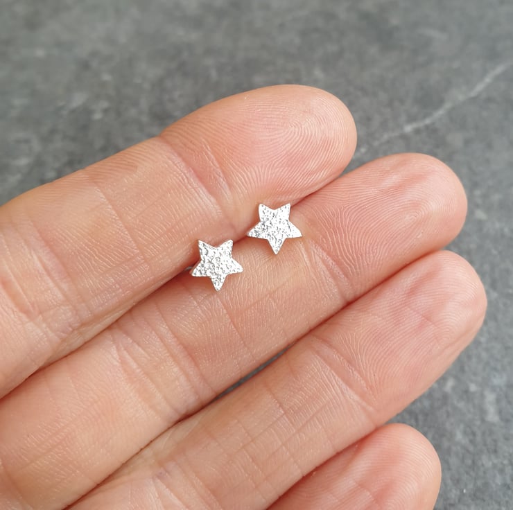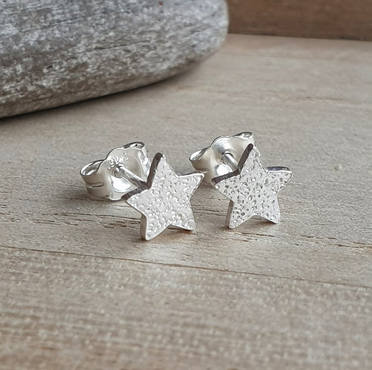 These small stud earrings have been cut by hand from thick silver sheet into star shapes, and given a sparkly, frosted texture which really catches the light. They come complete with sterling ear posts and butterfly backs and have been polished to a bright shine.