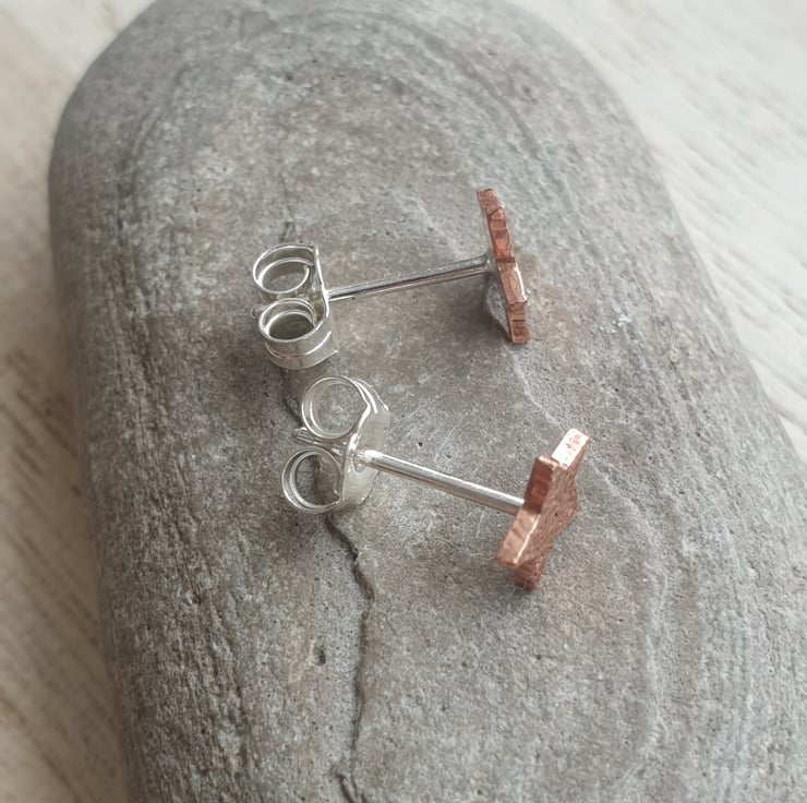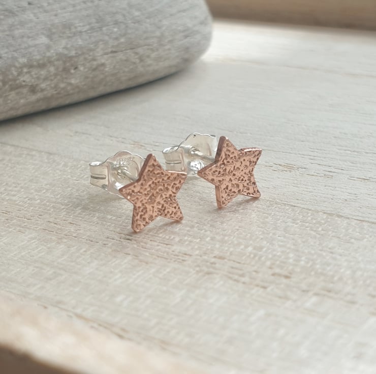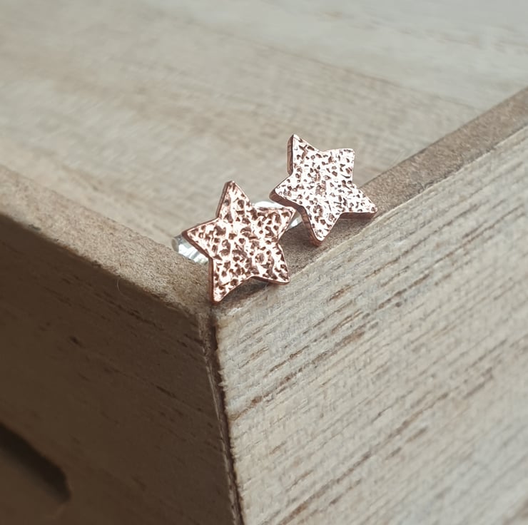 The little stars have been hand cut from chunky copper sheet, and textured with an almost sparkling pattern. The ear posts and scroll backs are sterling silver and securely soldered to the reverse.