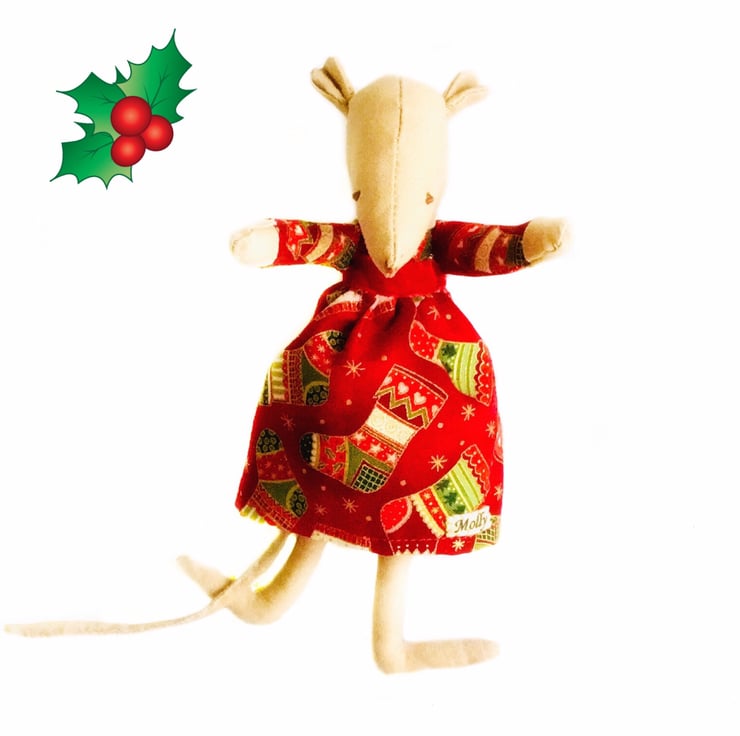 A pretty little Christmas mouse to brighten up your house this Christmas. Molly has a pretty red dress with a Christmas stocking print in gold and green. The dress has a red velvet waistband.