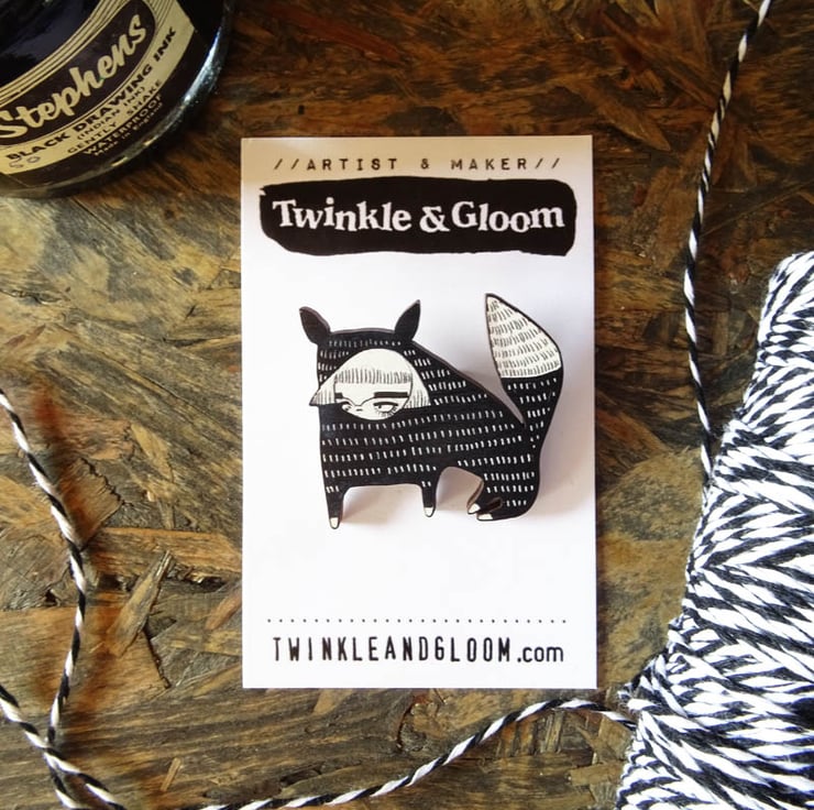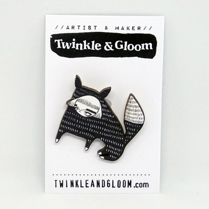 This listing is for a laser cut wood brooch of a Twinkle & Gloom design. The design features a girl in a fox costume.