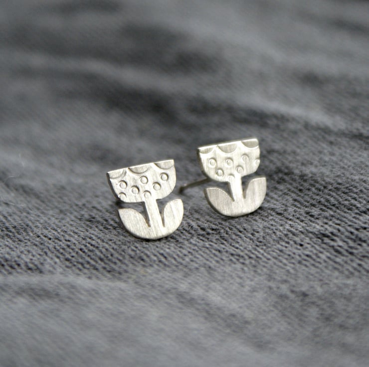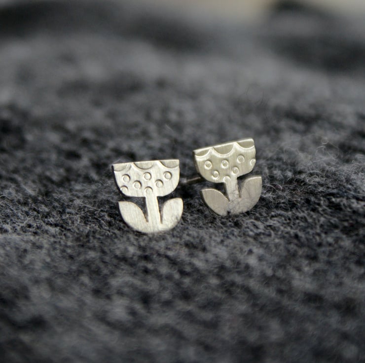 A cute pair of silver studs hand cut by me. They have a circle pattern for extra texture and are polished to a satin finish.