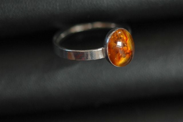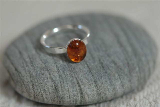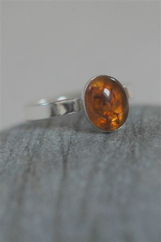 This silver ring features a gorgeous oval amber cabochon, 10x8mm, set in a sterling silver bezel cup. The amber is a lovely honey colour and contains some inclusions. The ring itself is made from 3.2mm wide sterling silver D-wire, with the curve on the inside, making it extremely comfortable to wear and easy to put on and take off. The ring in the photo is available in size O and weighs 2.9g. It has been polished to a high shine which reflects the light brilliantly. I can make other sizes to order.