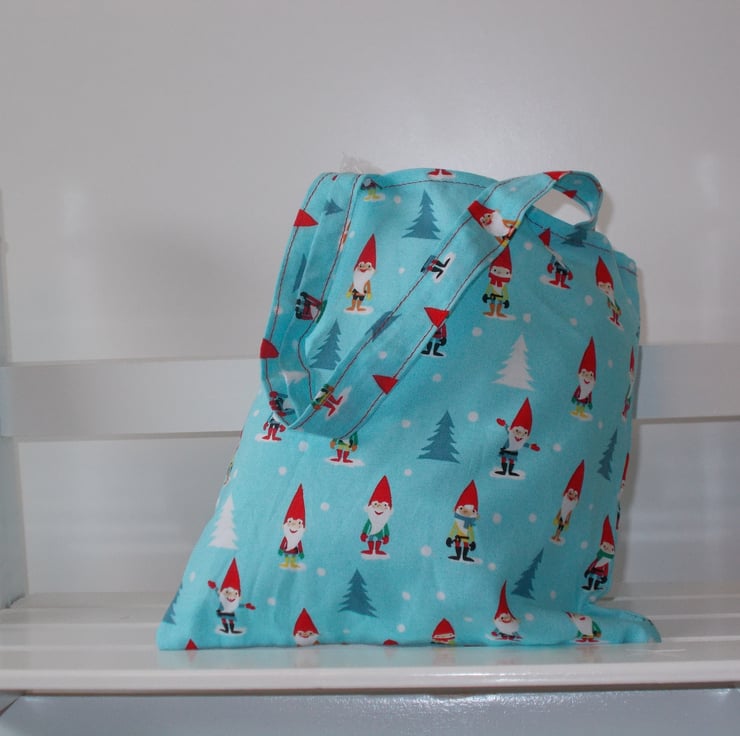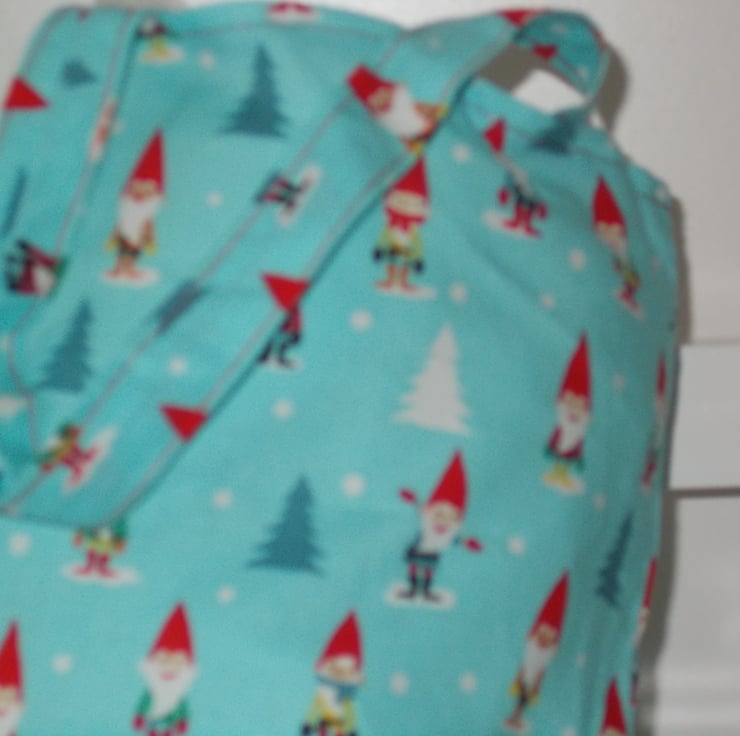 This fabric is printed with little elfs and Christmas trees on a blue background and has matching handles.