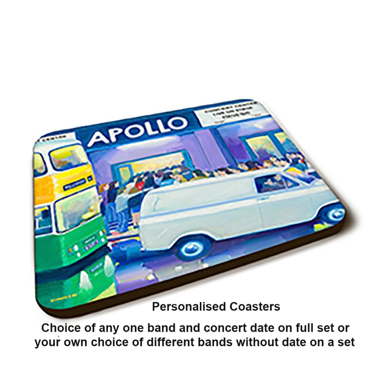 You can have the coasters of the Glasgow Apollo and the old Glasgow corporation bus personalised to your requirements by changing the band/artist on the Apollo facia board above door and the destination and route number on the old Glasgow bus. Just message me the details of changes required.