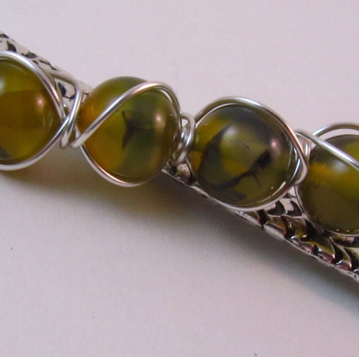 The dragon bookmark measures nearly 5 inches (12.3 cm) long and where the dragon head is at the top of the bookmark is 1 inch (2.5 cm) wide. The dragon vein agates are 8 mm in diameter. The tassel is 6 cm long.