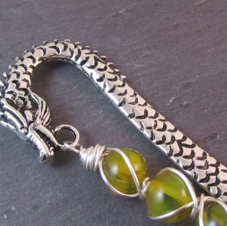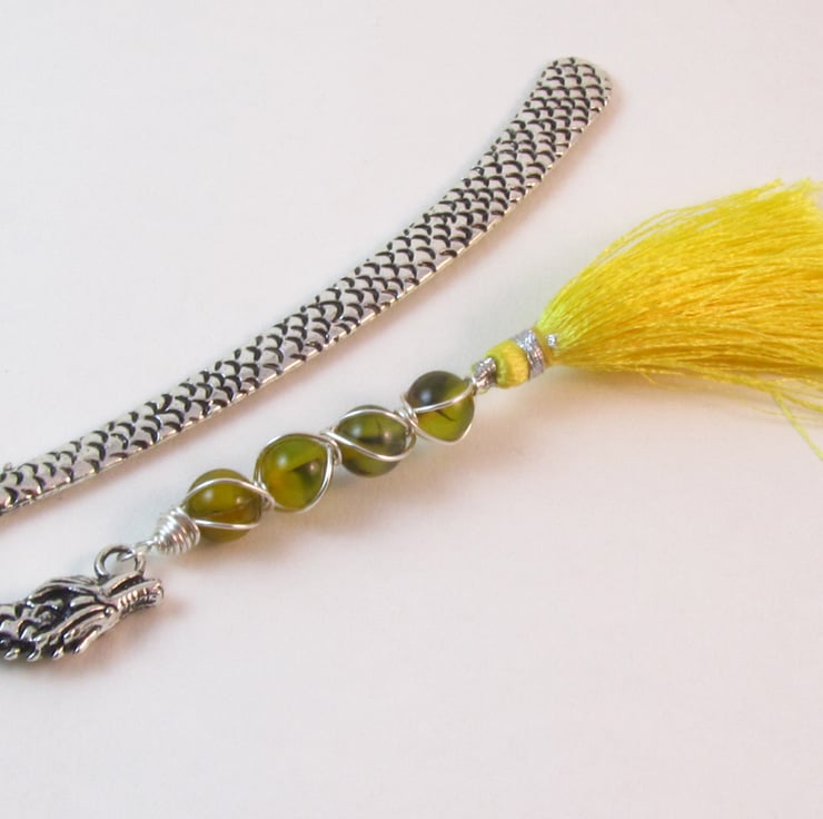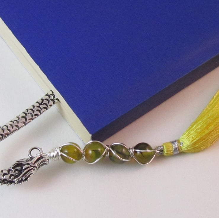 This is a stunning yellow agate dragon bookmark. It is created with real yellow dragon vein agate gemstones, silver plated copper wire, tassel, and a metal dragon bookmark. This is a great way to add to your fantasy reading. A wonderful gift for those who love dragons.