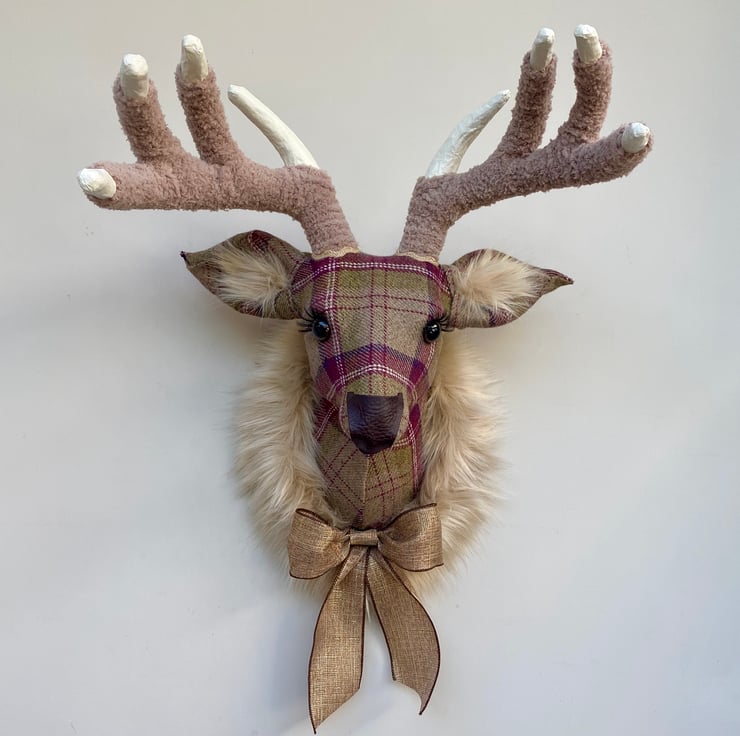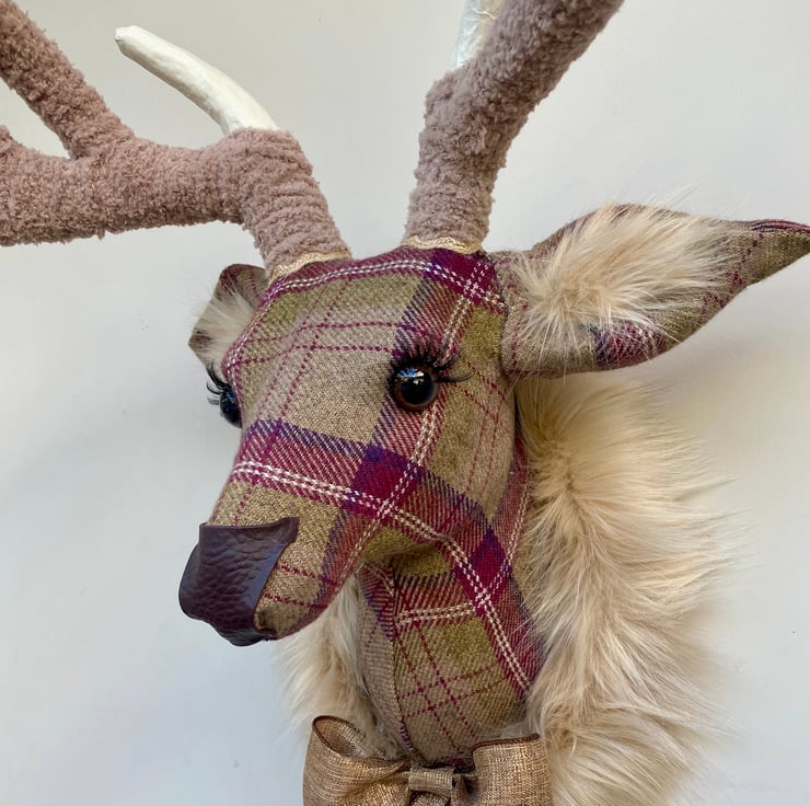 Handmade in a lovely berry plaid and check tweed wall mounted stag deer.
