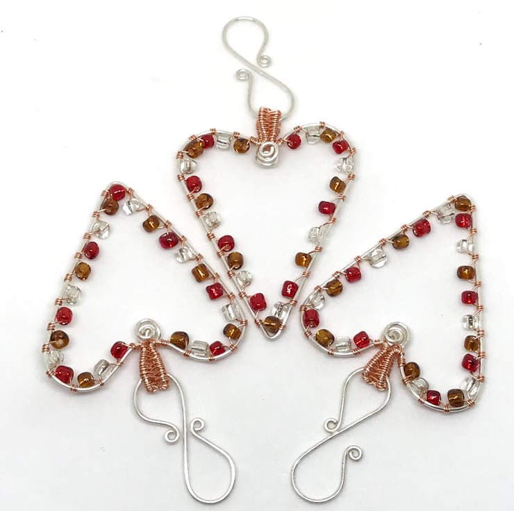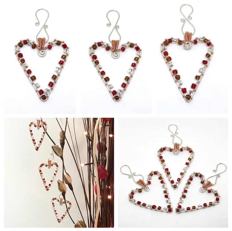 I have made these heart decorations with silver plated wire which I have formed into a heart shape. I have selected a combination of glass beads in red, bronze and silver and wrapped these around the hearts with copper wire. Each heart is completed with a silver plated hook.