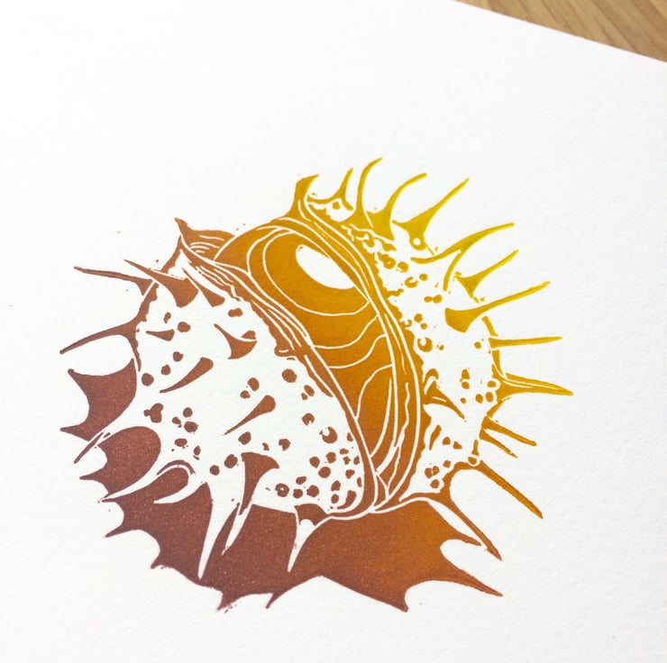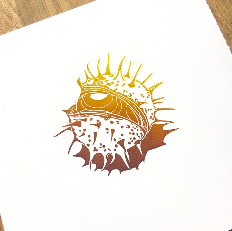 An original hand carved and printed linoprint. Depicting a horse chesnut seed (conker) emerging from it's seed pod.