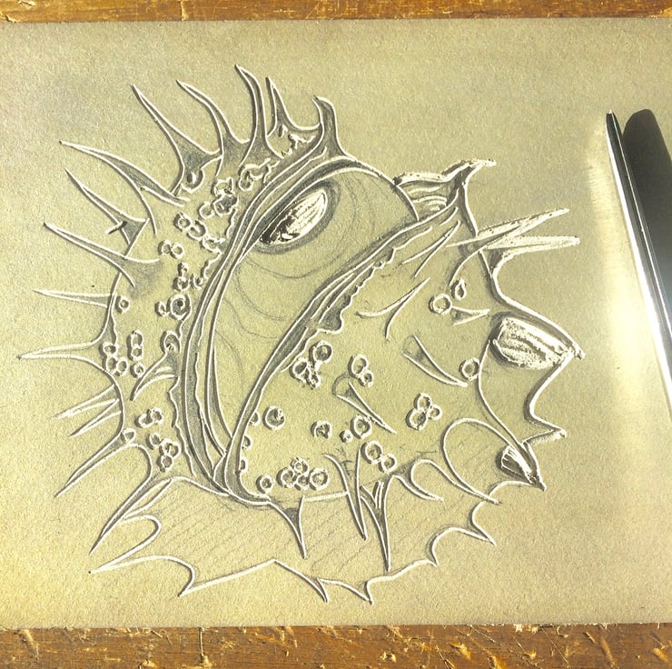 I drew the horse chestnut directly onto a piece of lino and carved it the same day. I used a colour blend of warm golden yellows to orange and browns to depict the beauty of the colours I'd see on the heath that day.