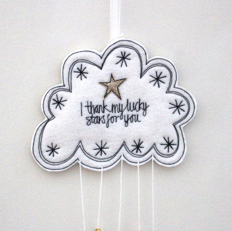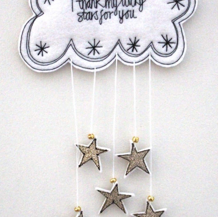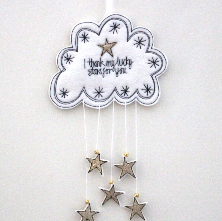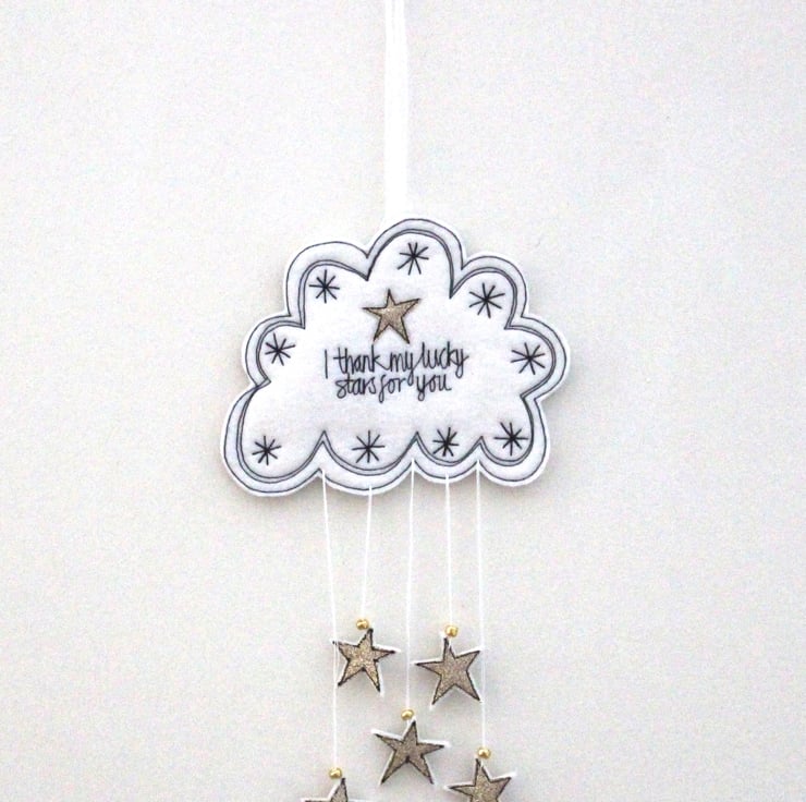 A little cloud, with five stars suspended beneath and the words 'I thank my lucky stars for you', will decorate any room especially a nursery.