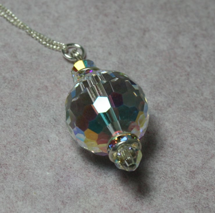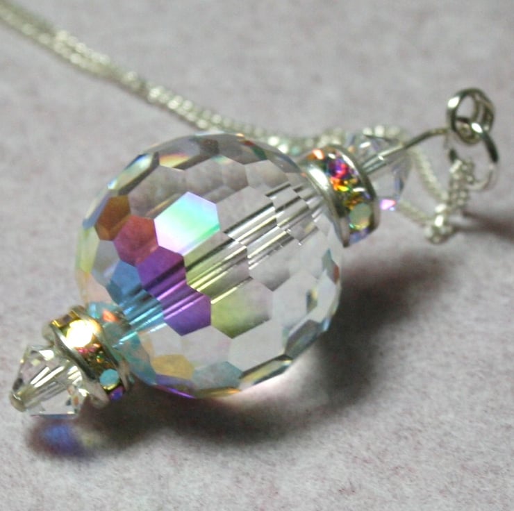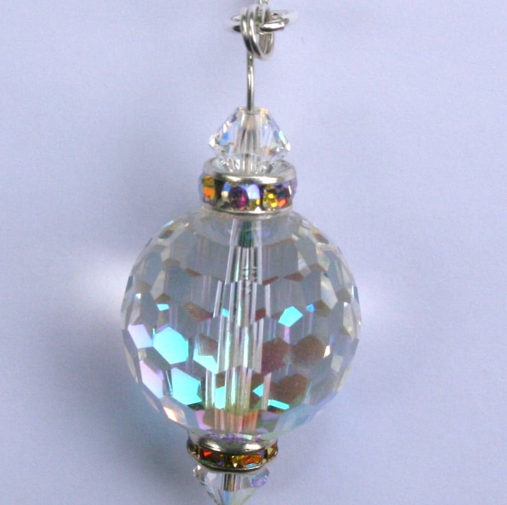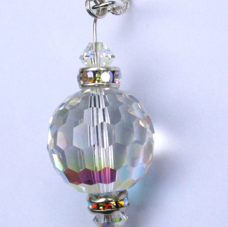 I loved this Swarovski crystal element bead so much that I made one of these necklaces for myself. The bead is multi faceted and has an ab coating so it reflects surrounding colours. I have also added ab rondelles ot the top and bottom of the headpin for even more glamour.