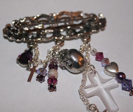 I love all things spooky, but I don't think horror needs to be associated with just Halloween or black all the time. So I assembled this one of a kind brooch, dripping with charms and beads using a silver and purple colour palette.