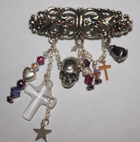 I love all things spooky, but I don't think horror needs to be associated with just Halloween or black all the time. So I assembled this one of a kind brooch, dripping with charms and beads using a silver and purple colour palette.