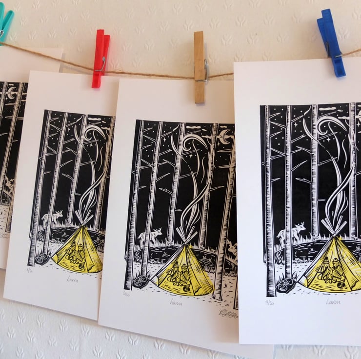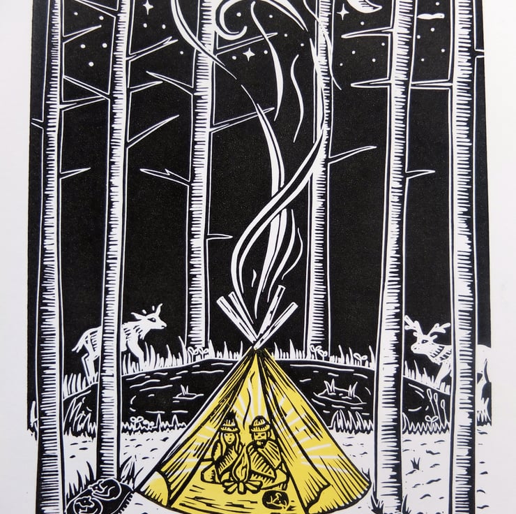 This design came from a brief from this year's print exchange on Instagram which was "freedom". I was insprired by the idea of people leaving behind their old lives in busy, perhaps unfulfilling jobs to live in the wilderness. Lavvu is a temporary tent used by the Sami in Scandinavia, often to follow reindeer herds. This print is made up of two layers, I used yellow ink within the tent to show the warm glow of the fire through the canvas, definitely channelling some hygge!