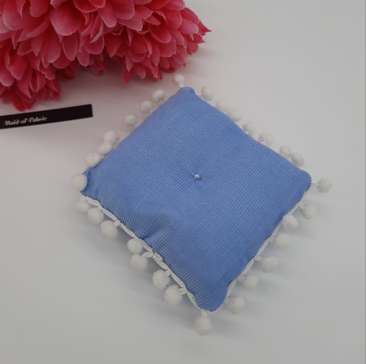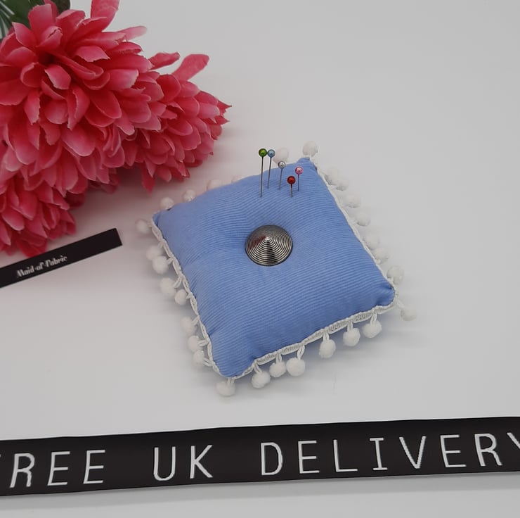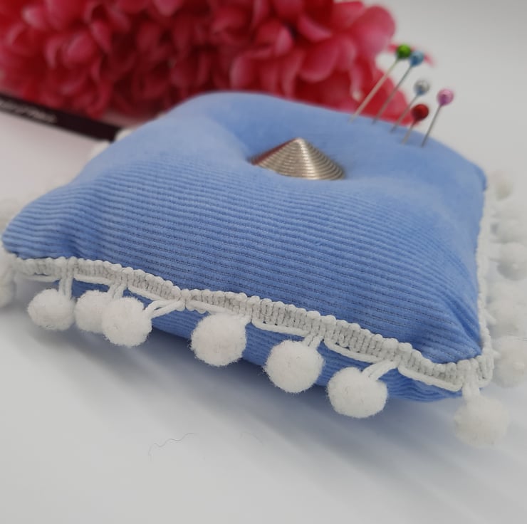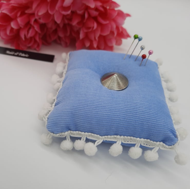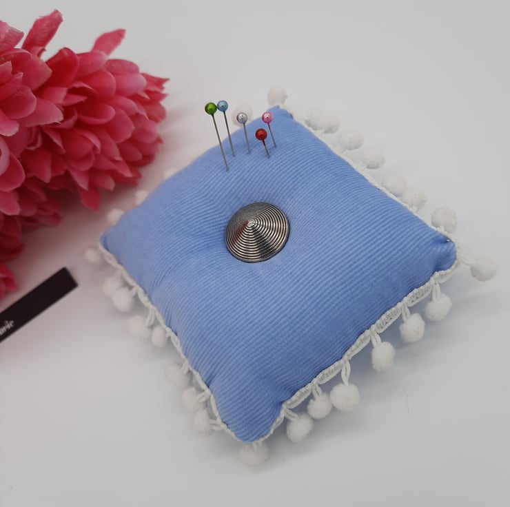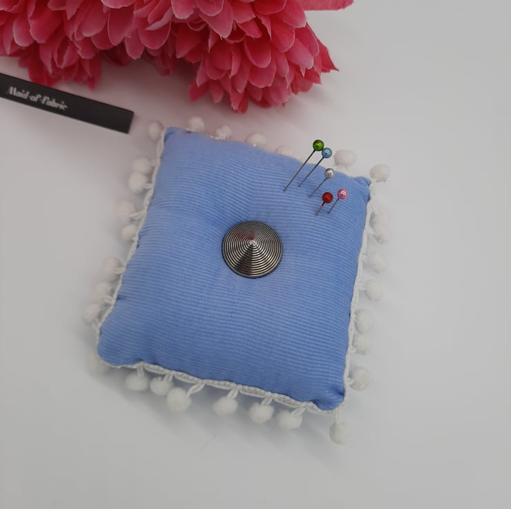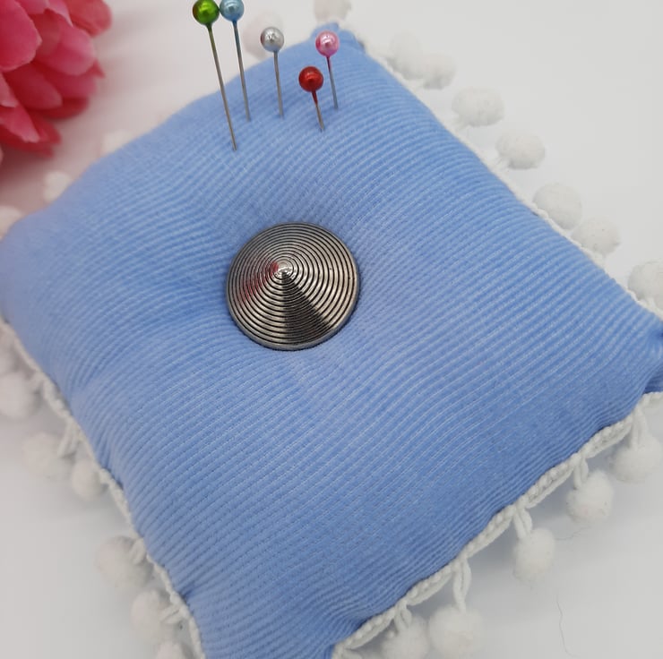Pin cushion in blue with white bobble trim and a silver button in the middle.